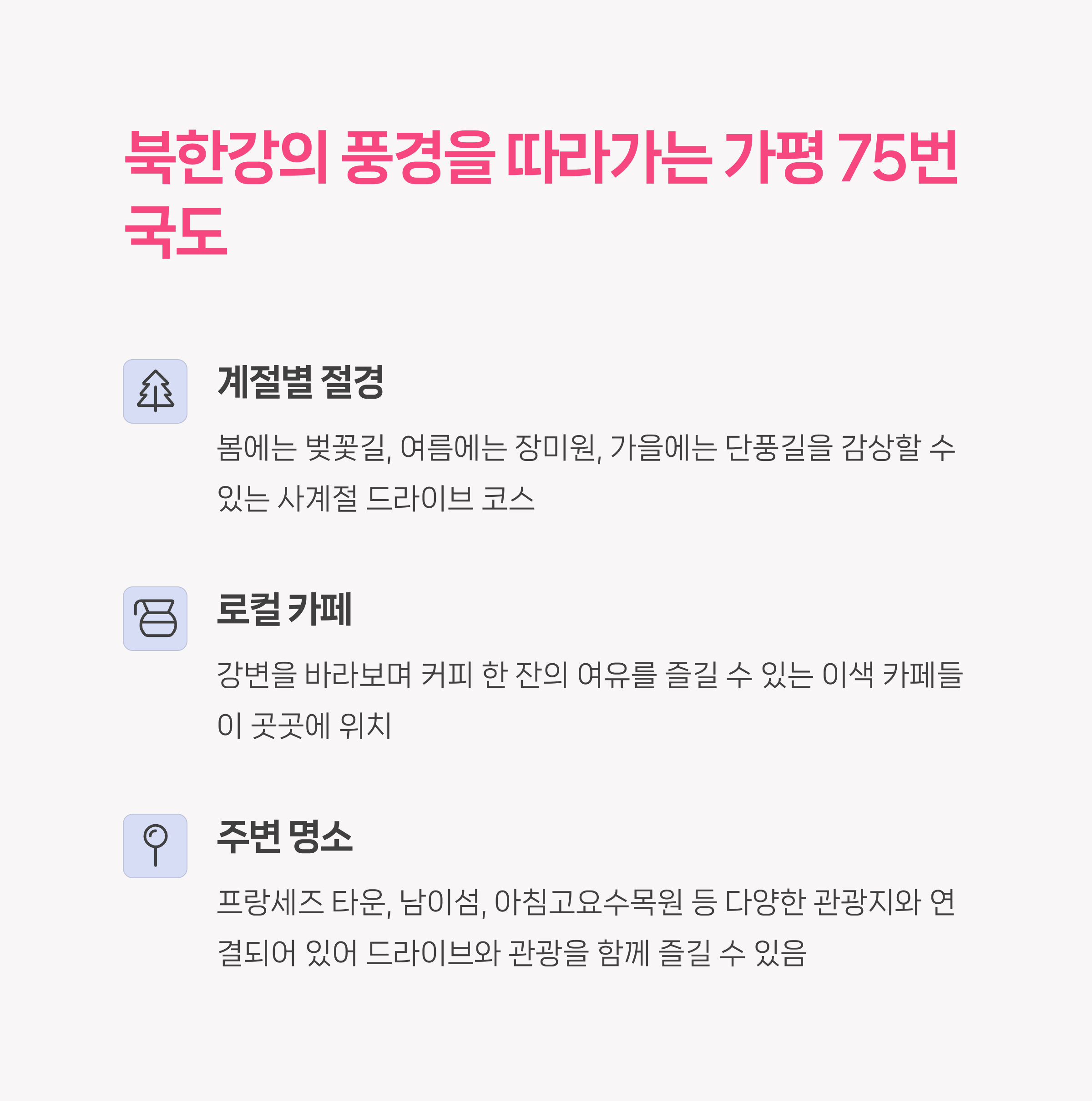 | 드라이브 명소 | 자연 풍경과 도심을 동시에 즐길 수 있어요 |