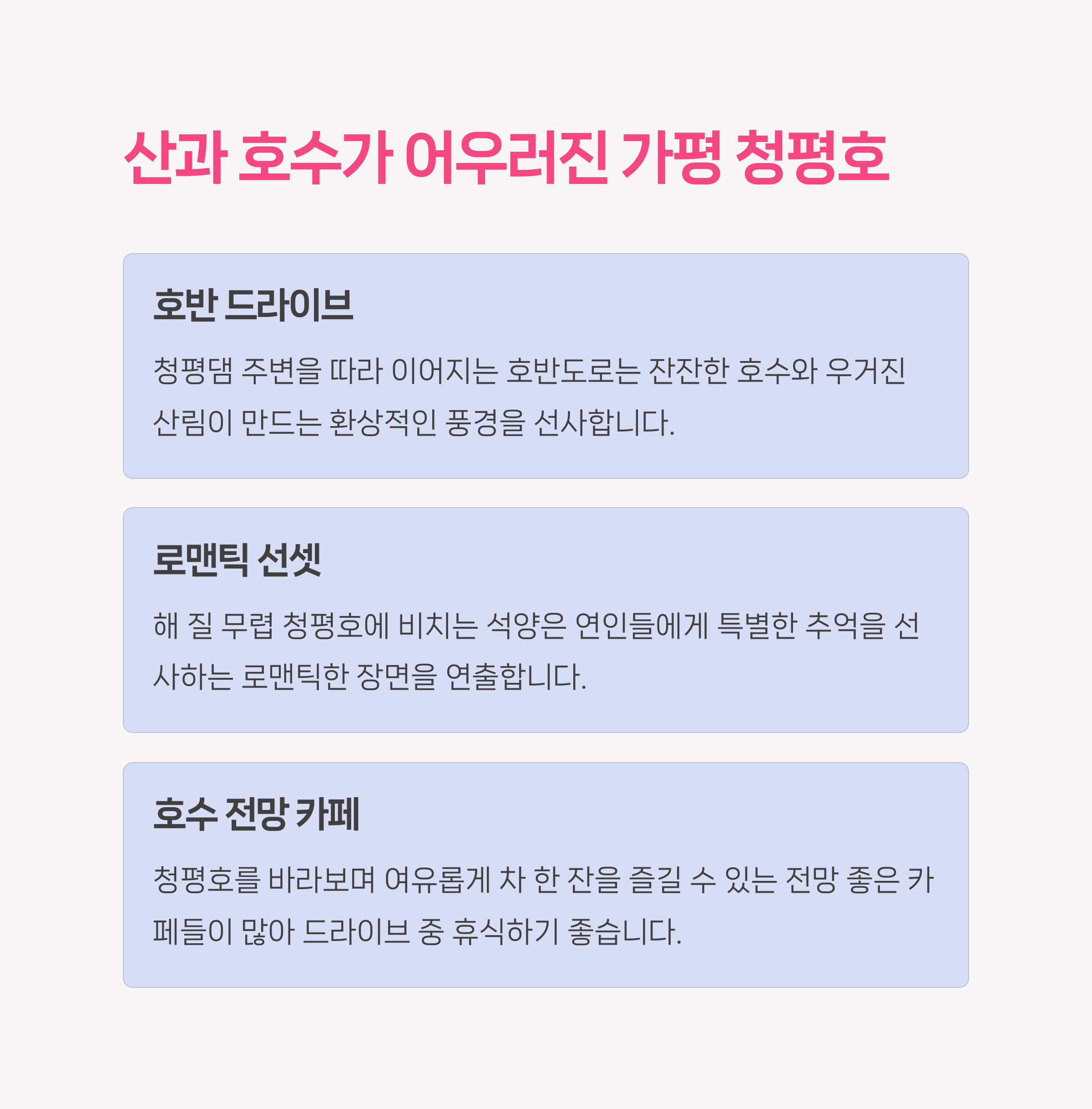 청평댐을 중심으로 형성된 이 호수는 맑은 수질과 주변의 울창한 산세가 조화를 이루며 도심에서는 보기 힘든 평온함을 줍니다.