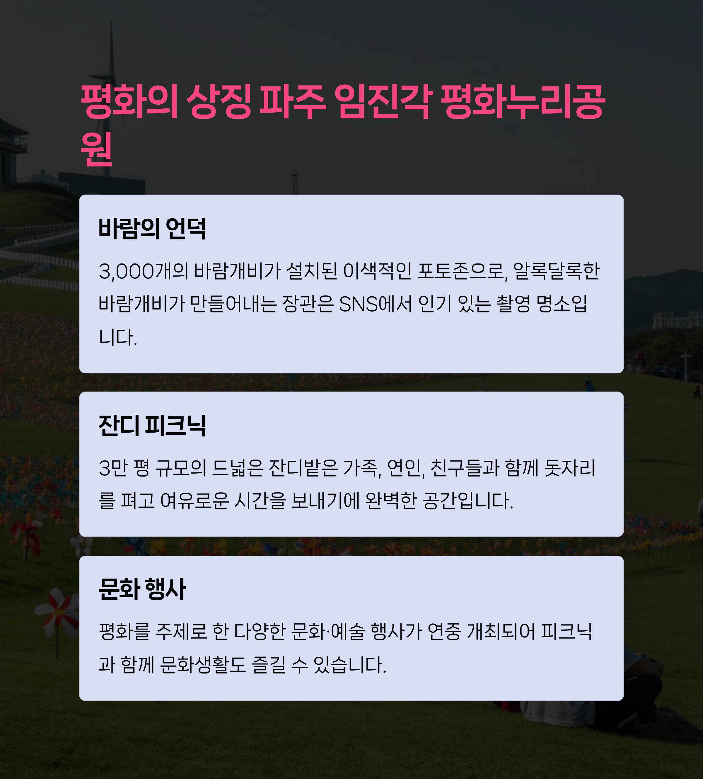 피크닉 장소를 찾고 있다면 남양주 물의 정원과 시흥갯골생태공원, 파주 임진각 평화누리공원을 추천드려요.🎯