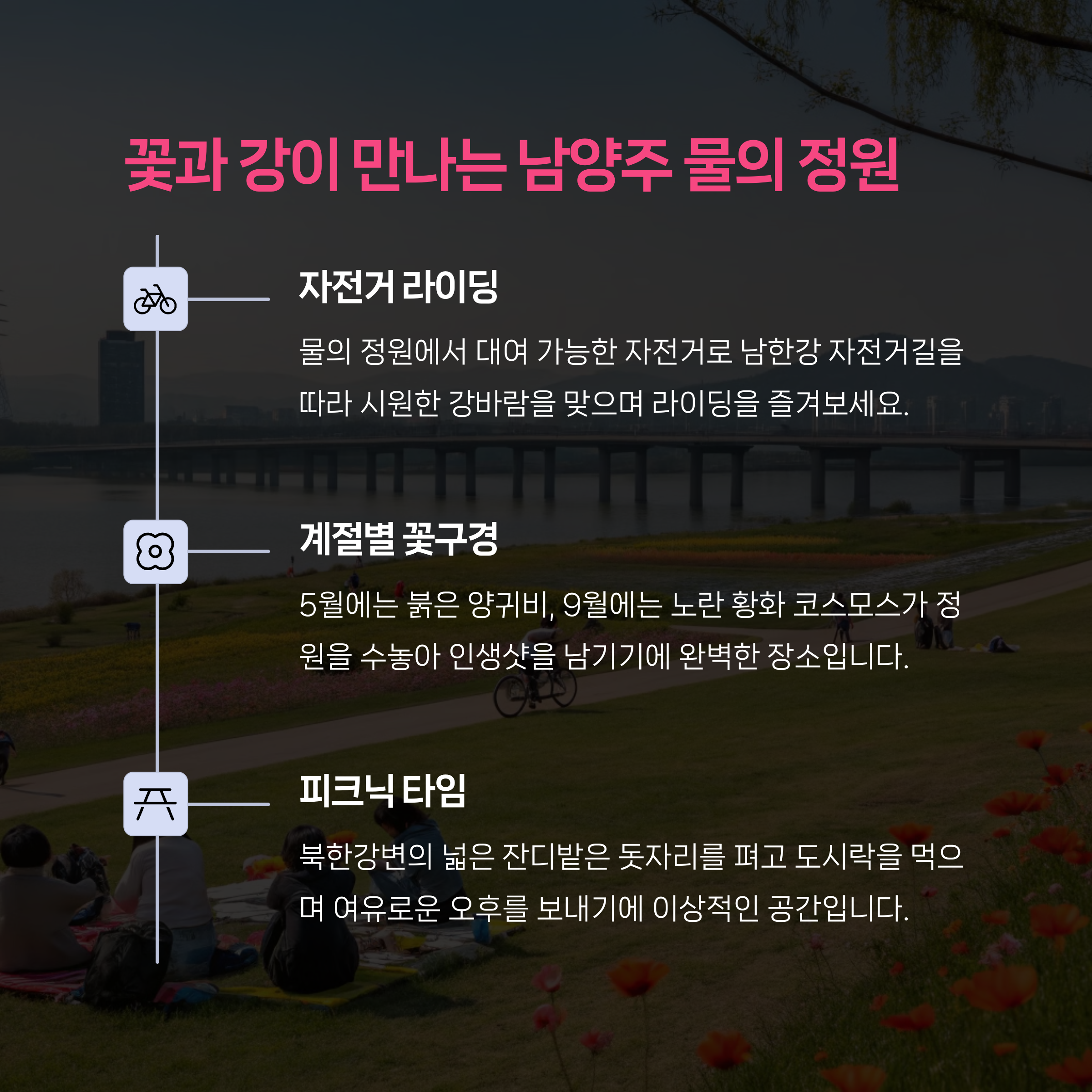 북한강변에 위치한 남양주는 잔디밭과 꽃길이 조화를 이루고, 시흥은 갯벌과 갈대숲이 인상적인 생태 공간입니다.