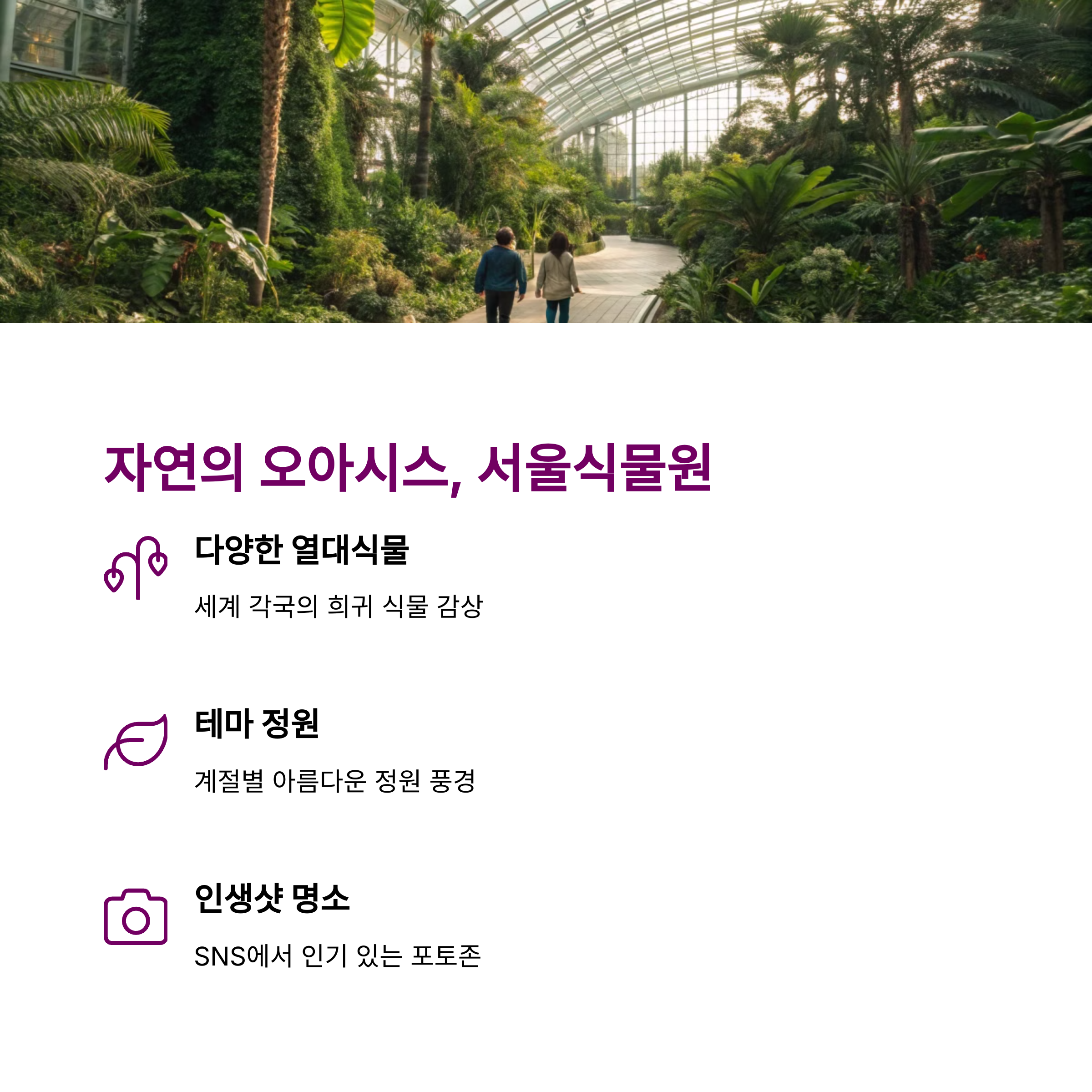 서울식물원은 초록의 힐링과 온실 속 따뜻한 공간을 모두 느낄 수 있어 혼자만의 여유 시간에도 좋아요.