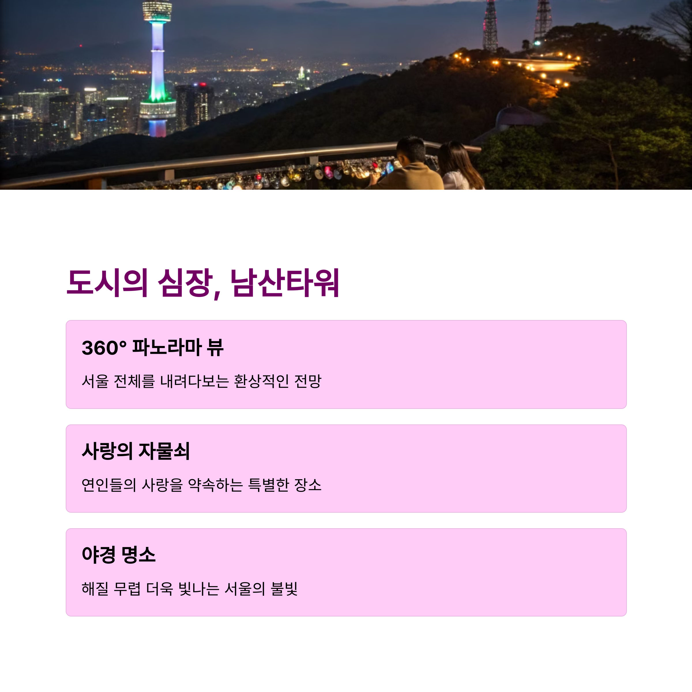 남산타워는 케이블카 또는 도보로 올라가며 서울 시내 전경을 한눈에 담을 수 있는 로맨틱한 데이트 장소입니다.💖