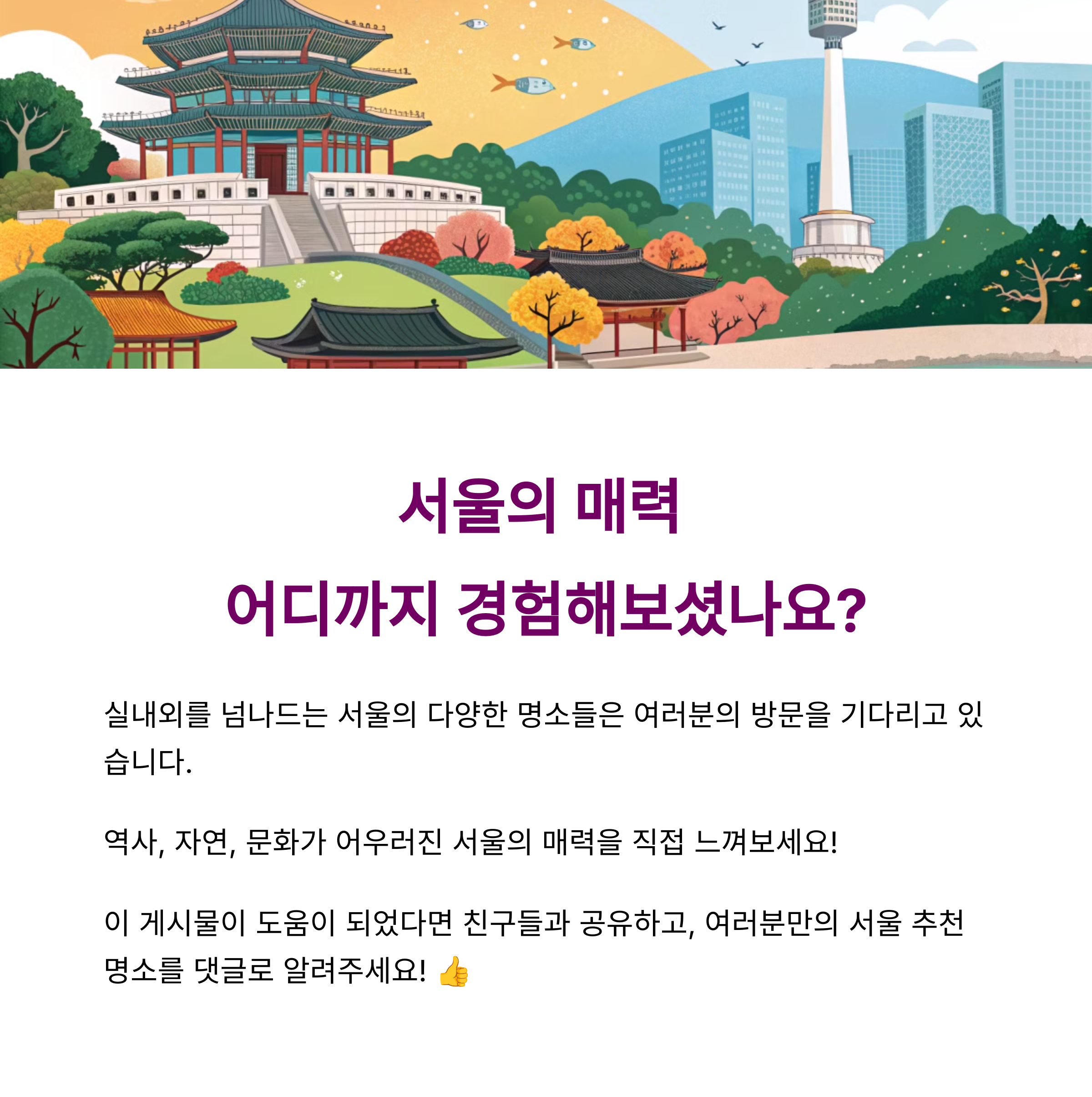 오늘은 실내와 야외로 나누어 서울의 매력을 느낄 수 있는 명소들을 소개해드릴게요.🚀