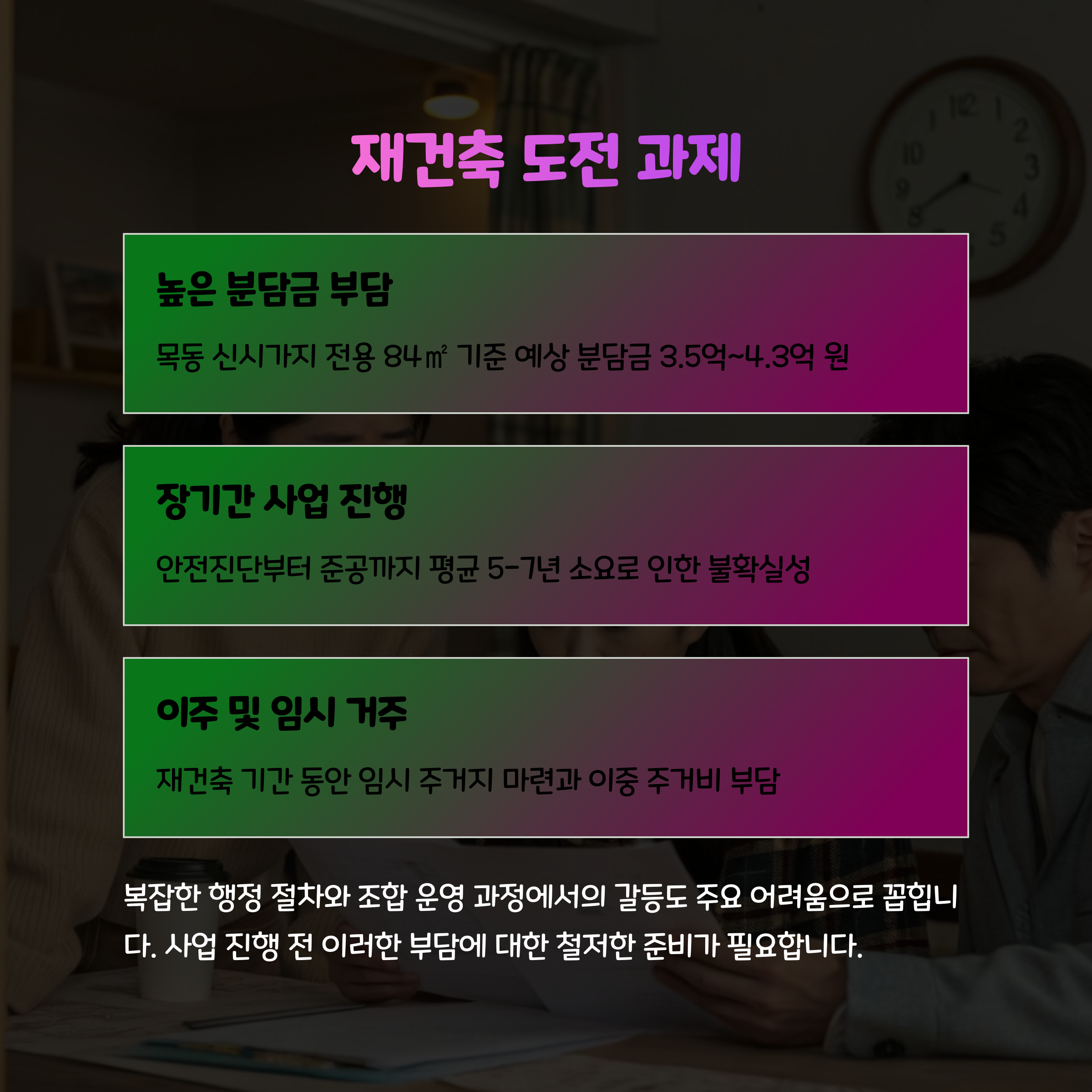 사업 기간이 매우 길고 복잡한 절차로 인해 지연 가능성이 높으며, 조합원 간 갈등이나 비용 부담 문제가 발생할 수 있습니다.