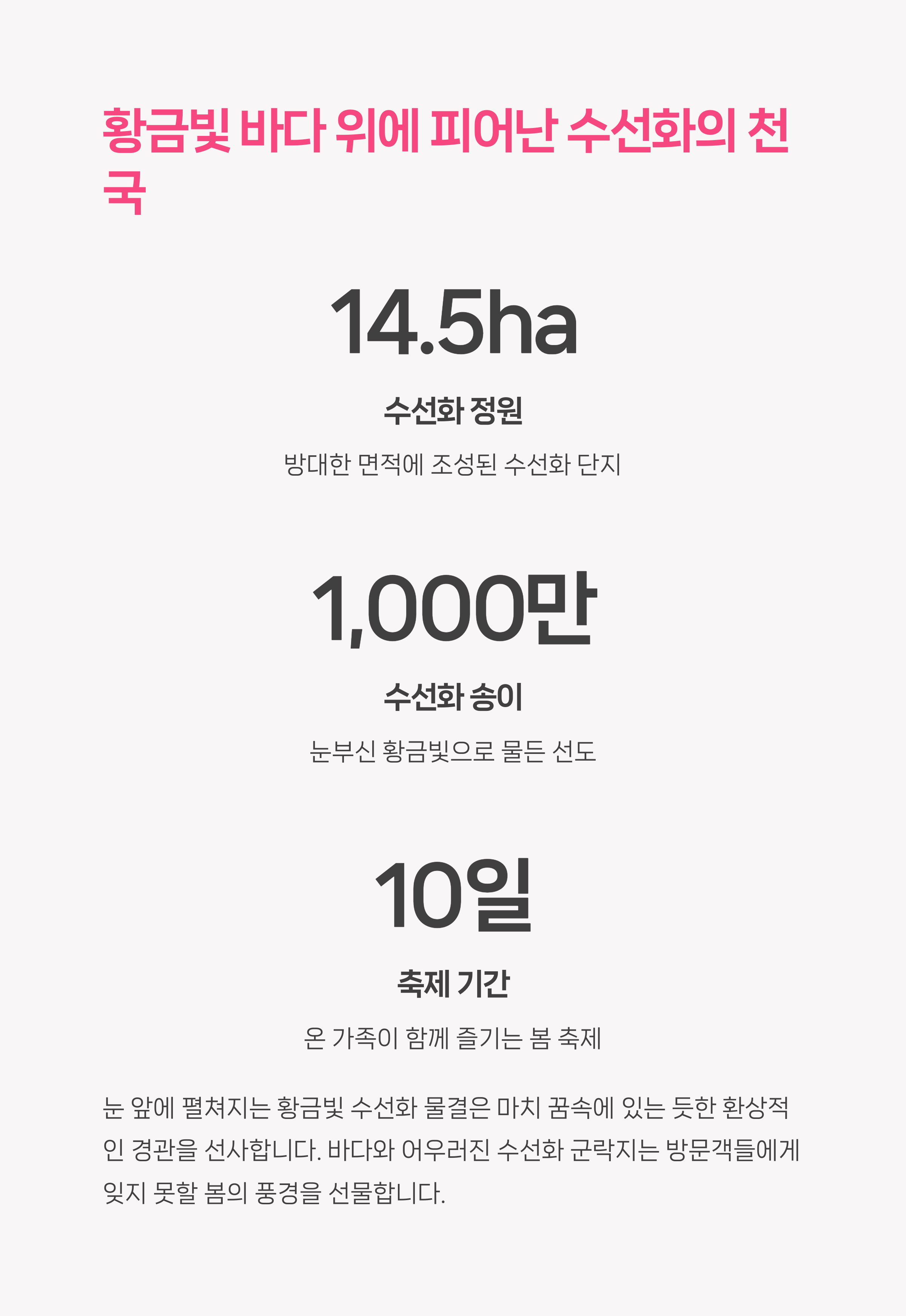 2025년 4월 4일부터 13일까지 열리는 이번 축제는 전국 최대 규모의 수선화 군락지에서 펼쳐지는 특별한 경험을 제공합니다.