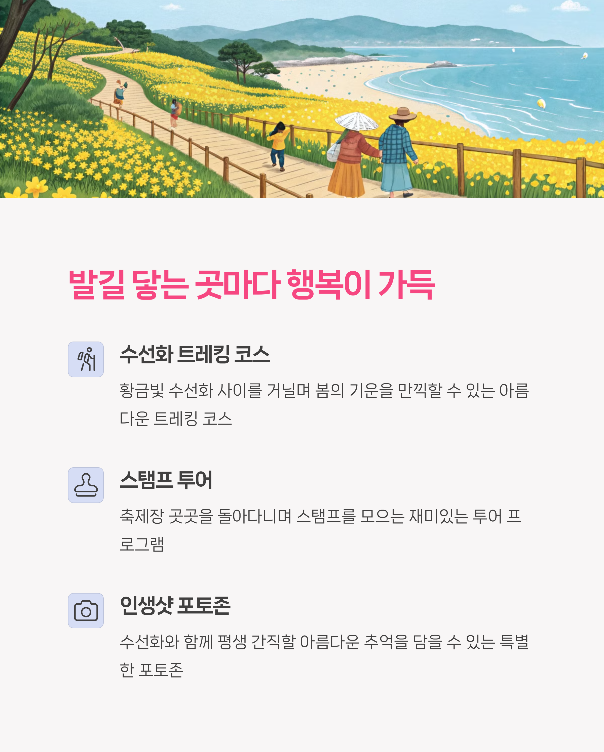 | 트레킹, 스탬프 투어 | 수선화와 함께하는 봄꽃의 향연 | 세발낙지, 지역 특산물 |