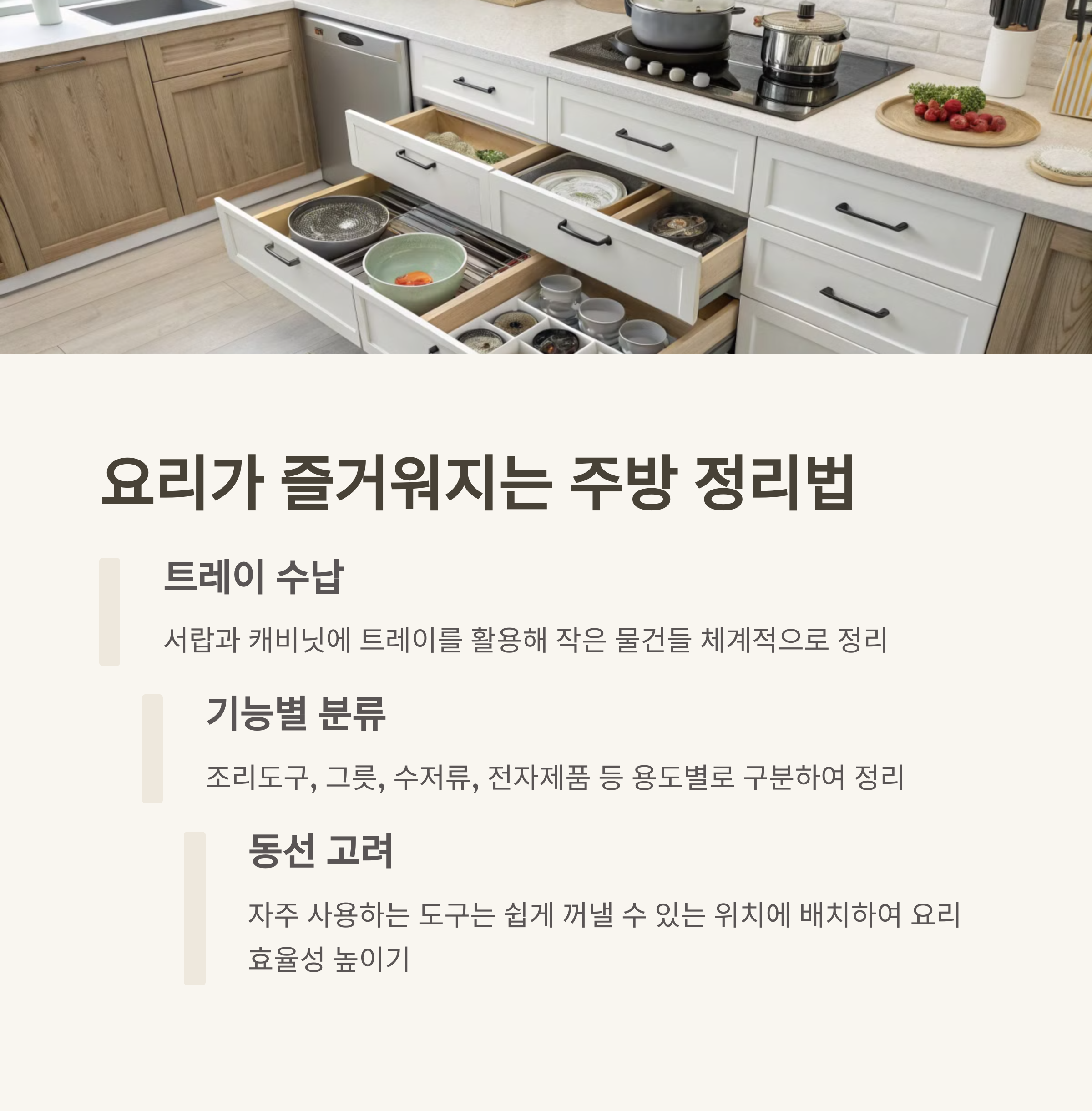 - 자주 쓰는 용품은 동선에 맞게 배치: 냄비, 프라이팬 등은 가스레인지 근처, 양념통은 조리대 옆에 두는 것이 좋습니다.