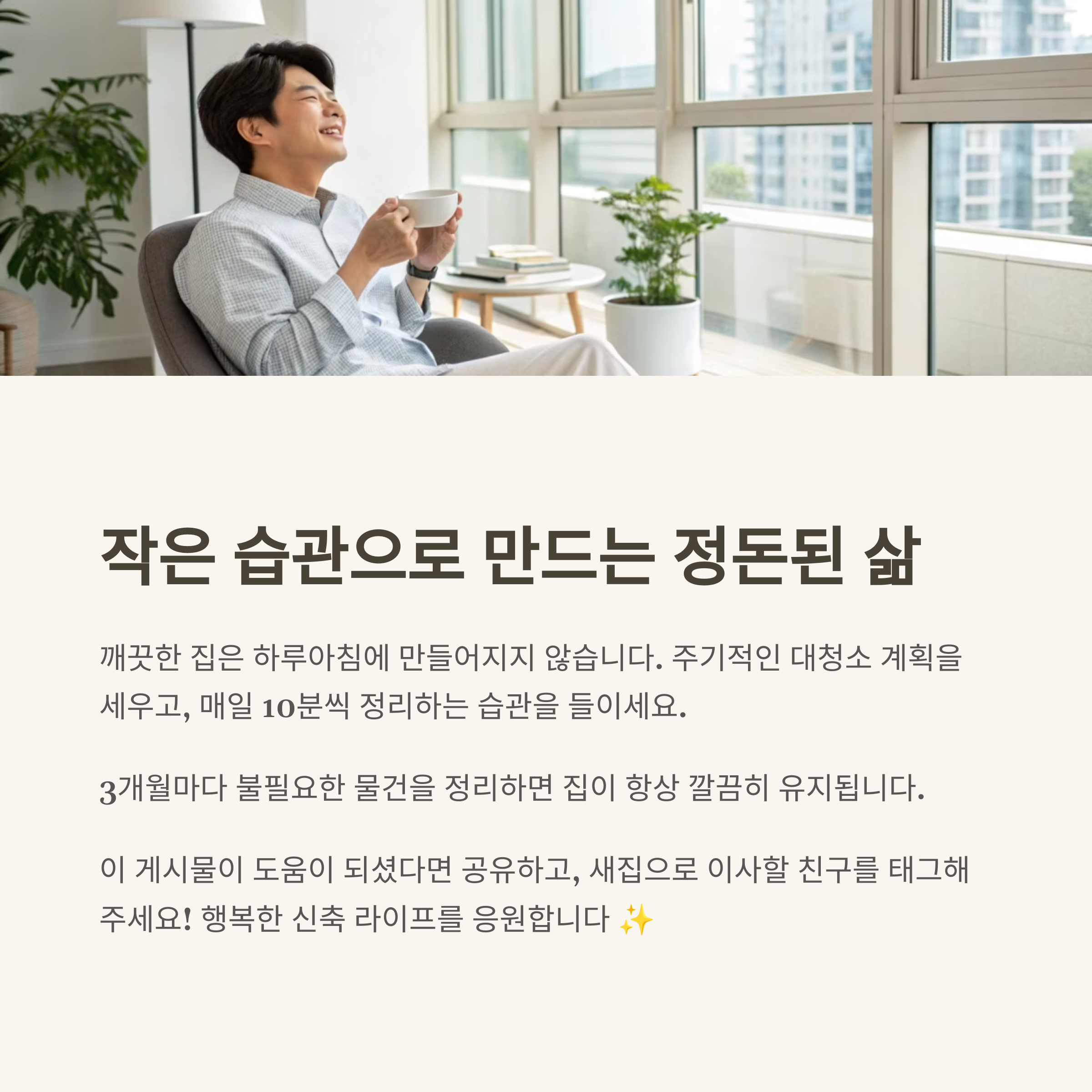 오늘 소개해 드린 청소 및 정리 노하우를 활용해 보다 깨끗하고 편안한 새집 생활을 시작해 보세요! 🏡✨