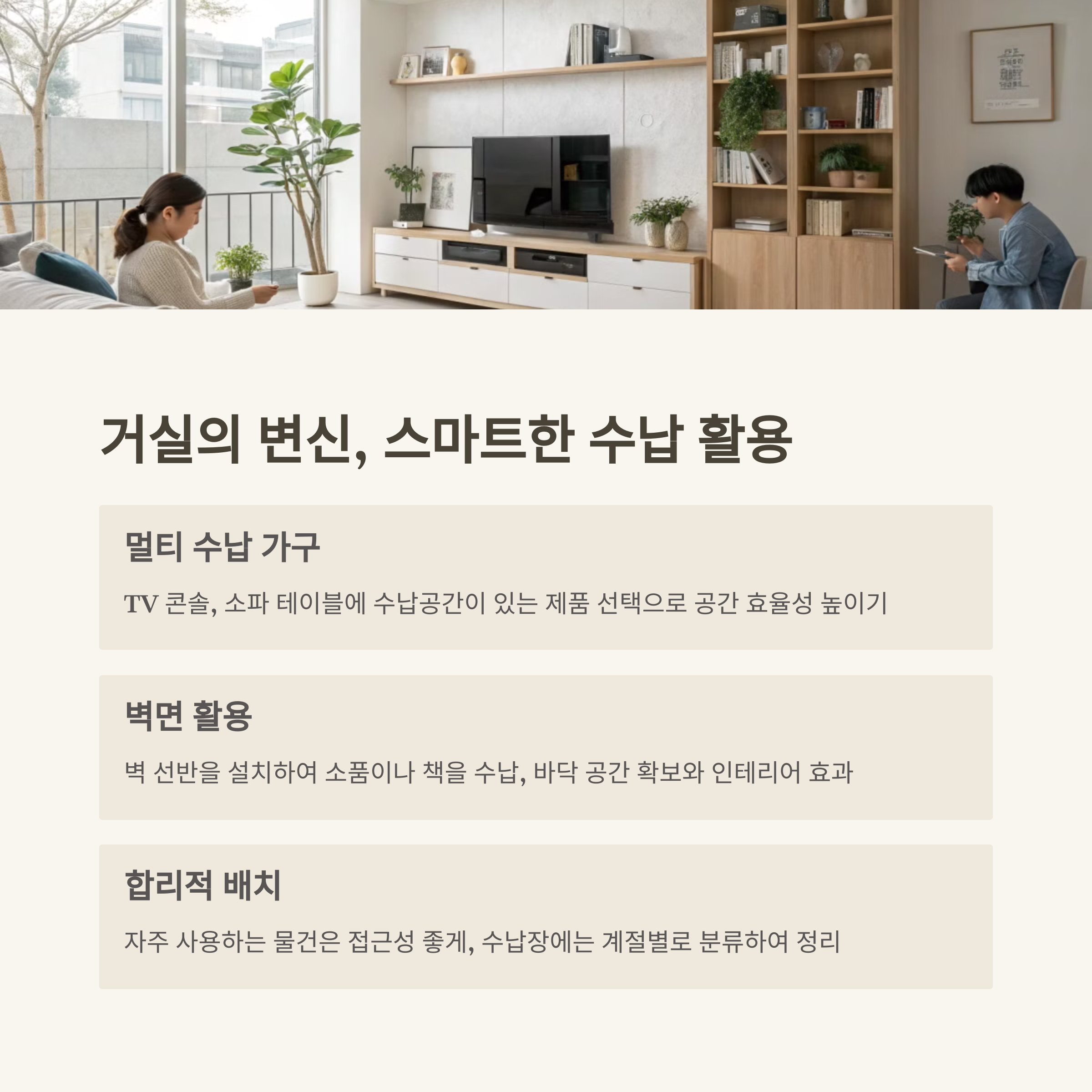 - 멀티 수납 가구 활용: 거실 테이블이나 소파 아래에 수납공간이 있는 제품을 사용하면 효율적입니다.
