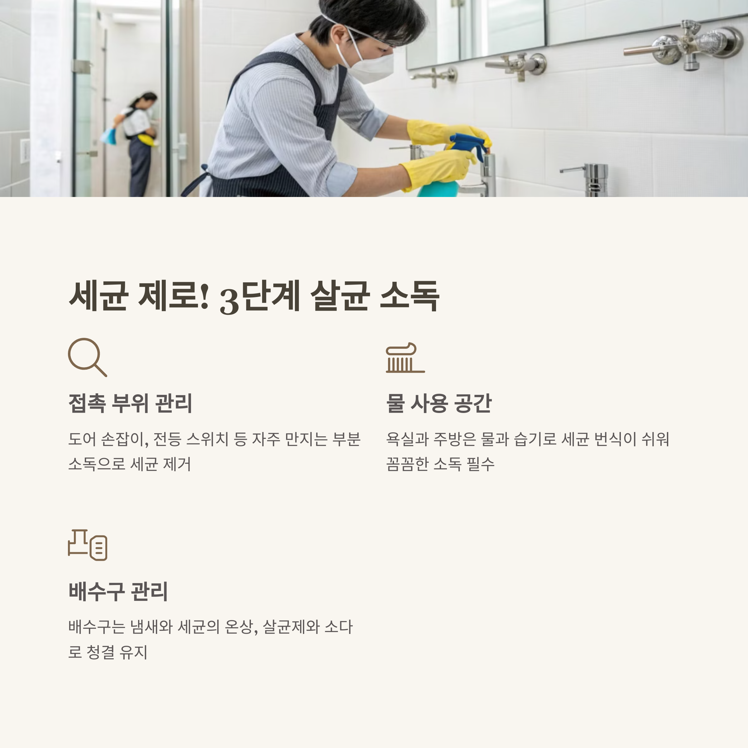 - 욕실 및 주방 소독: 입주 전 욕실과 싱크대 내부를 락스나 과탄산소다로 소독한 후 깨끗한 물로 헹궈주세요.