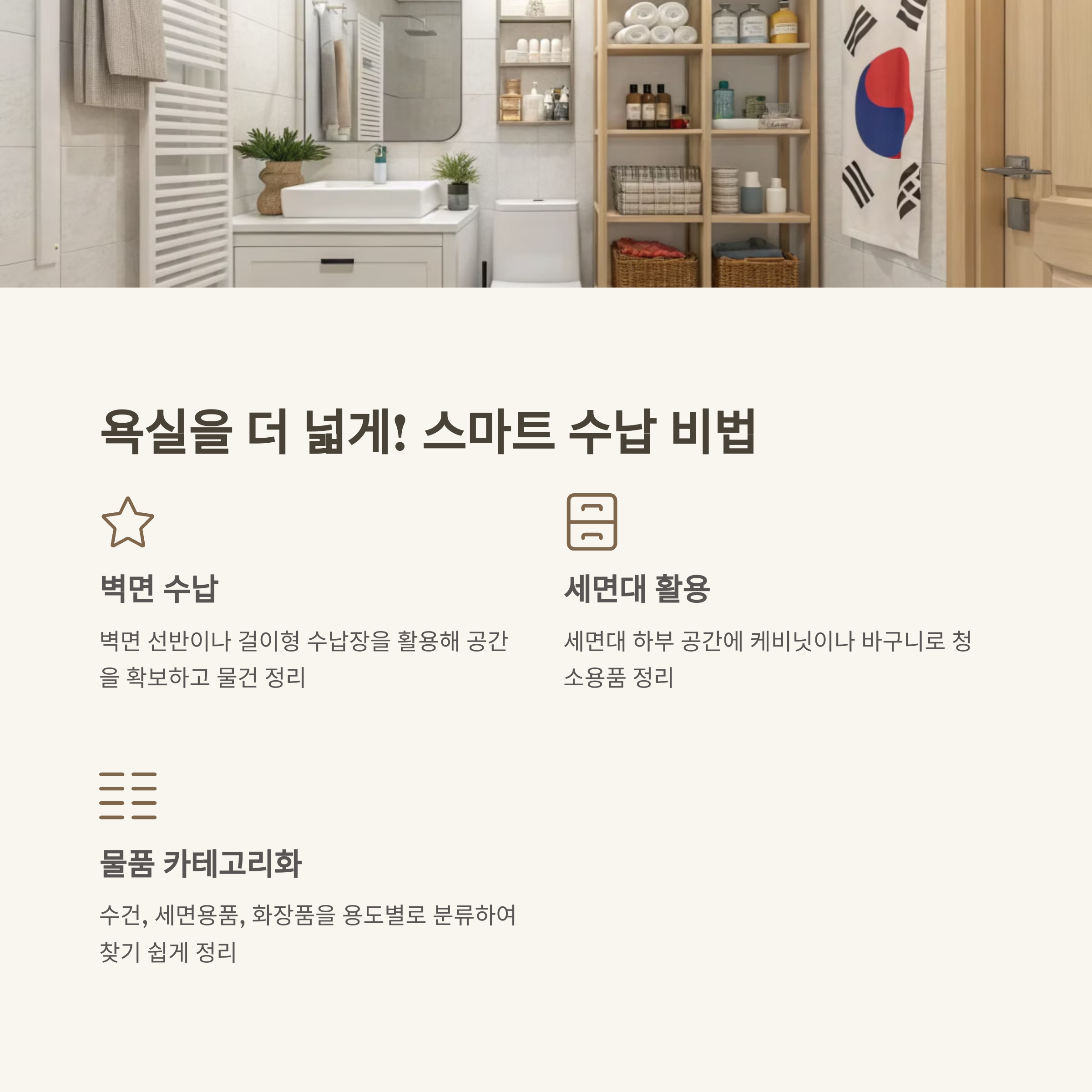 - 벽면 수납 활용: 샴푸, 바디워시 등 욕실 용품은 벽걸이 선반을 설치하면 깔끔하게 정리할 수 있어요.