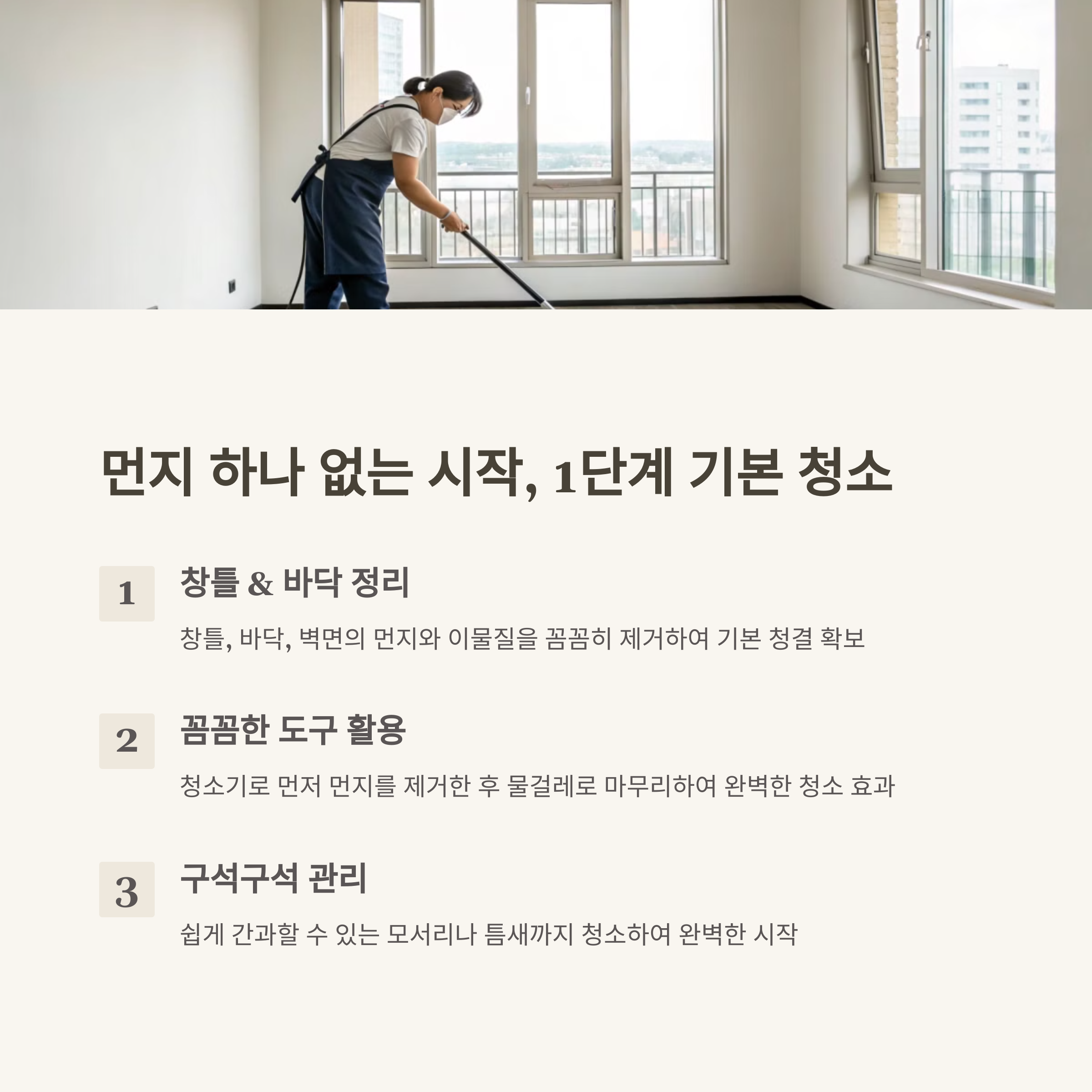 - 바닥 먼지 제거: 입주 전에는 미세먼지가 많으므로, 마른 걸레로 먼지를 닦아낸 후 물걸레질을 합니다.