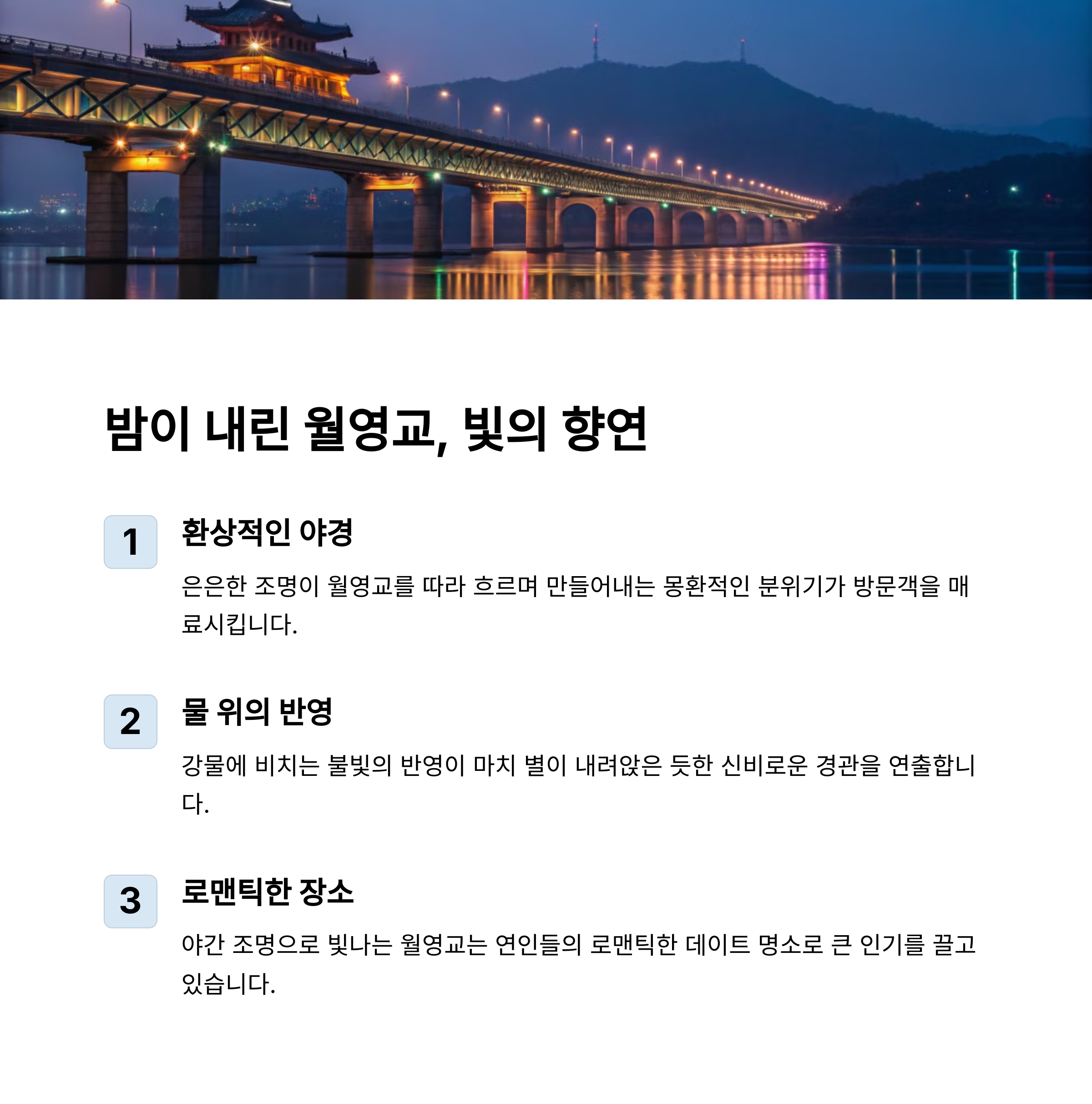 월영교의 야경은 많은 여행객들이 찾는 이유 중 하나입니다. 해가 지면 다리의 조명이 하나씩 켜지며, 그 불빛이 강물에 반사되어 환상적인 분위기를 만들어냅니다.