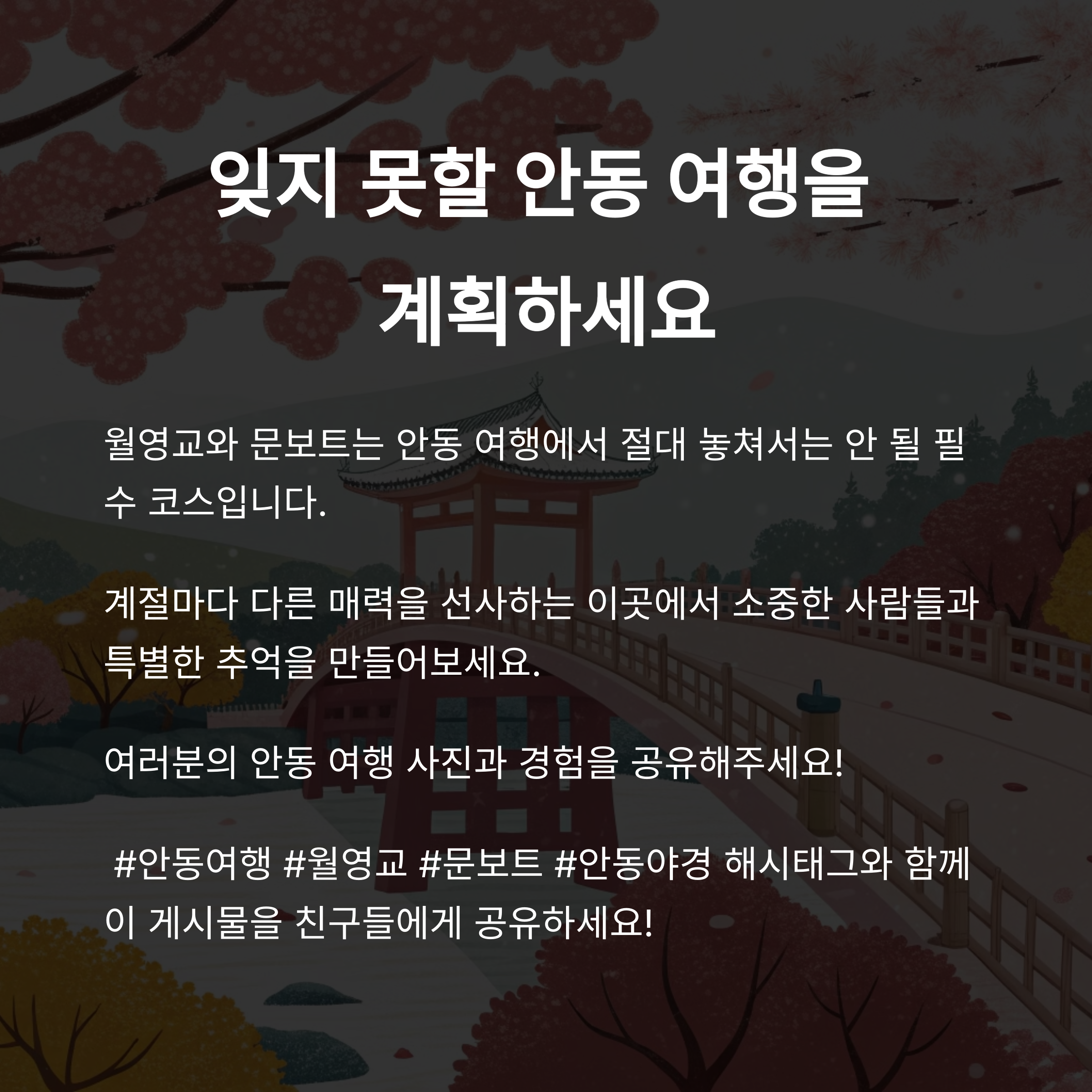 월영교는 안동을 대표하는 관광지로, 전통과 현대가 조화된 아름다운 장소입니다.