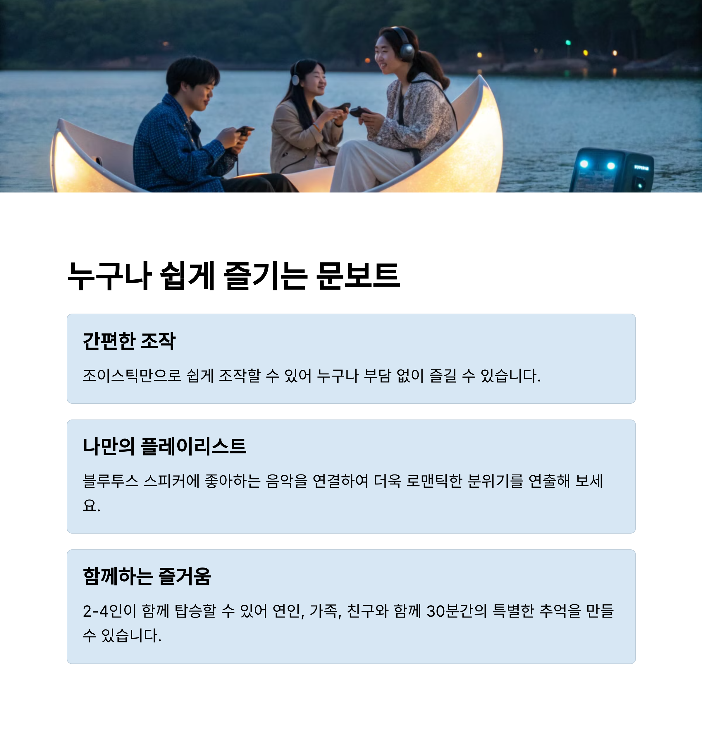 문보트는 둥근 원형 모양의 보트로, 조이스틱을 이용해 간단하게 조작할 수 있습니다. 블루투스 스피커가 내장되어 있어 음악을 들으며 로맨틱한 시간을 보낼 수 있습니다.