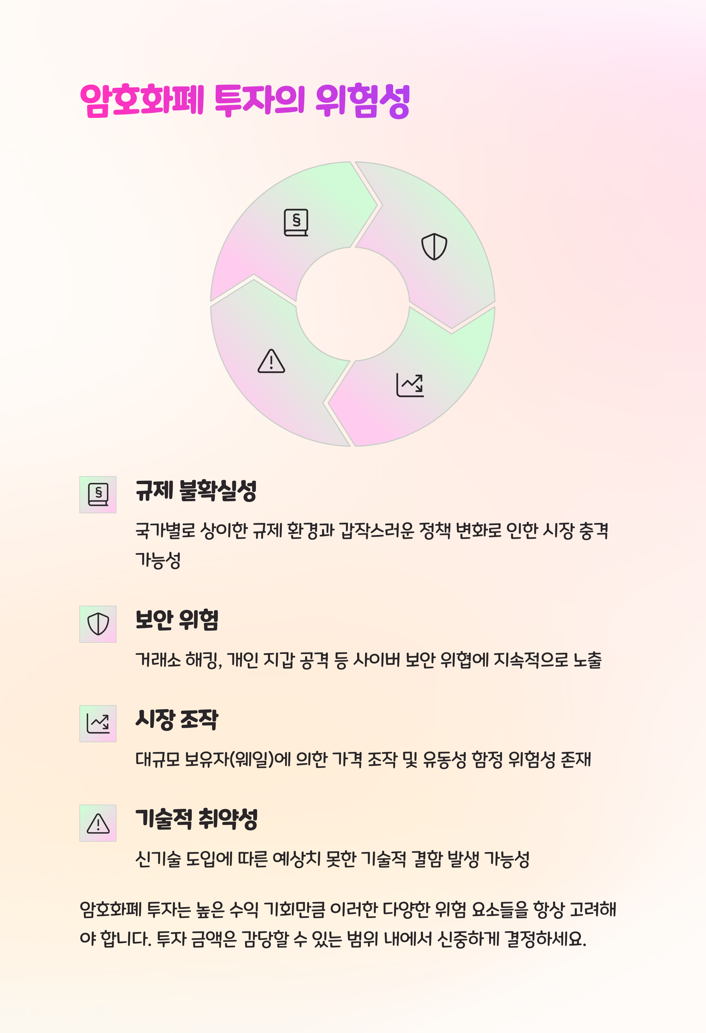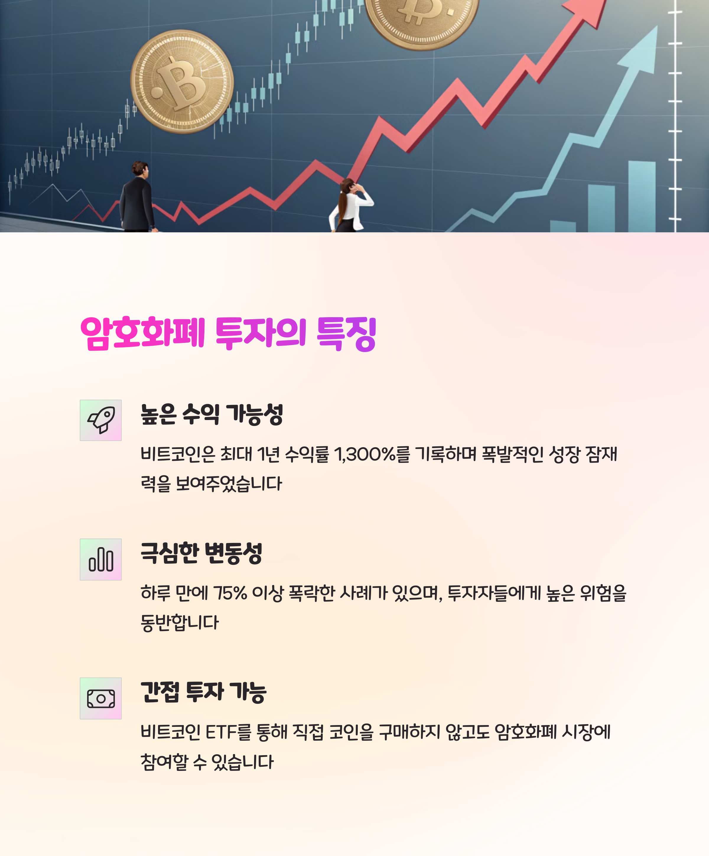 | 암호화폐 투자 | 높은 수익 가능성과 리스크를 동시에 지닌 디지털 자산 투자 |