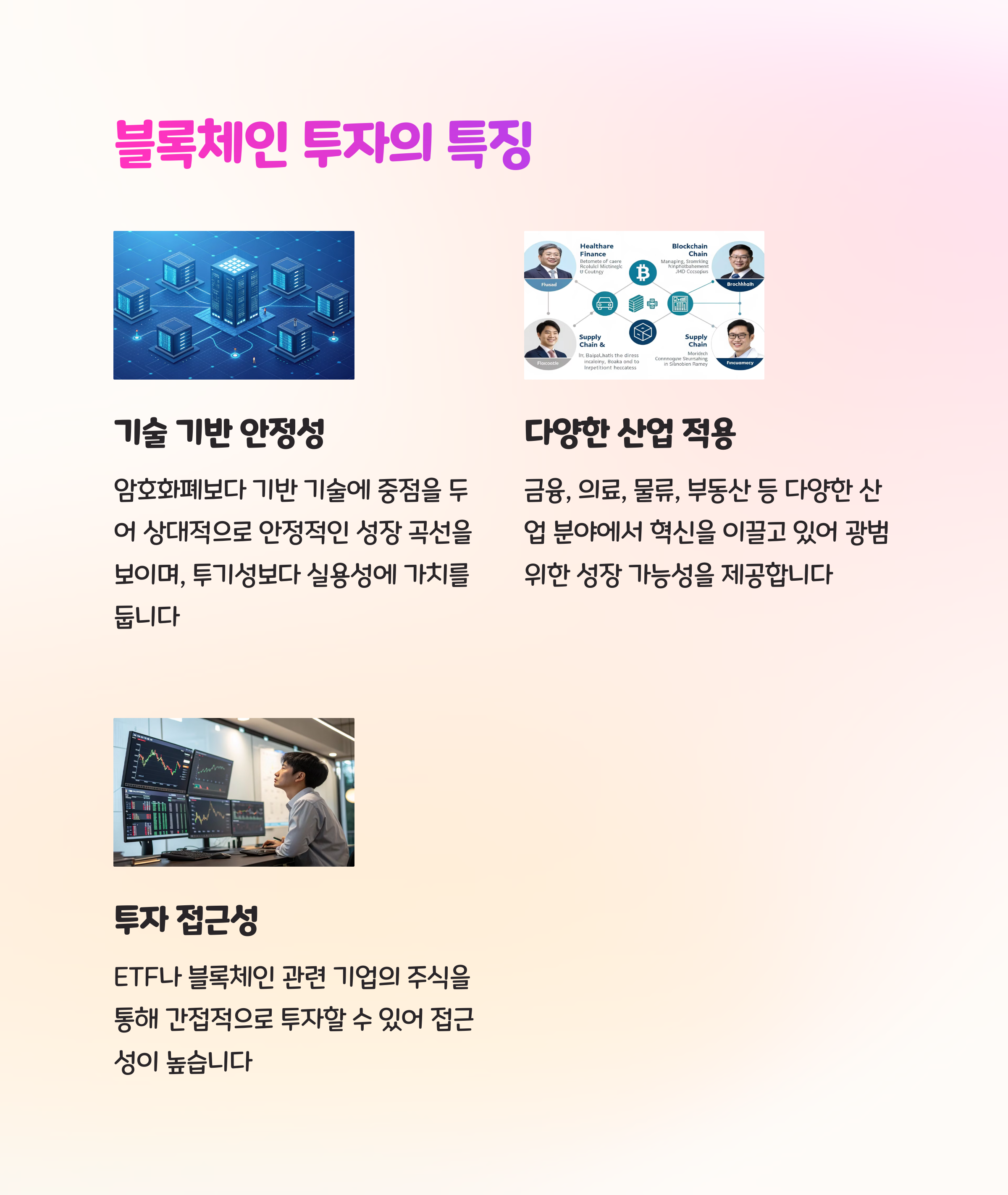 | 블록체인 투자 | 기술 기반의 안정적 투자, 다양한 산업 적용 가능성 |
