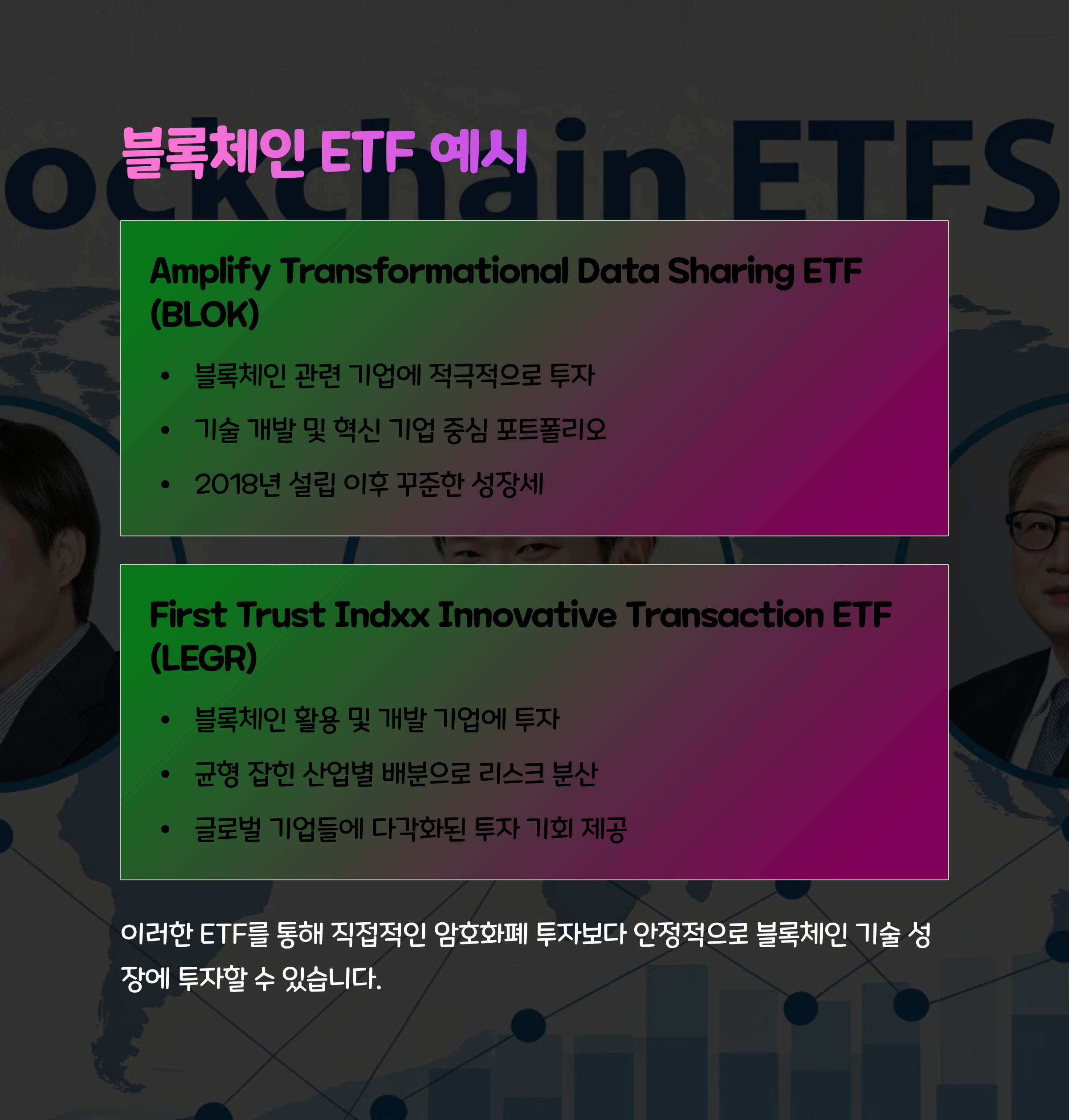 블록체인 ETF나 관련 주식에 투자하는 방식은 기술 성장에 기반한 안정적인 투자 수단으로, 변동성이 낮고 중장기적으로 안정적인 수익을 기대할 수 있습니다.😀