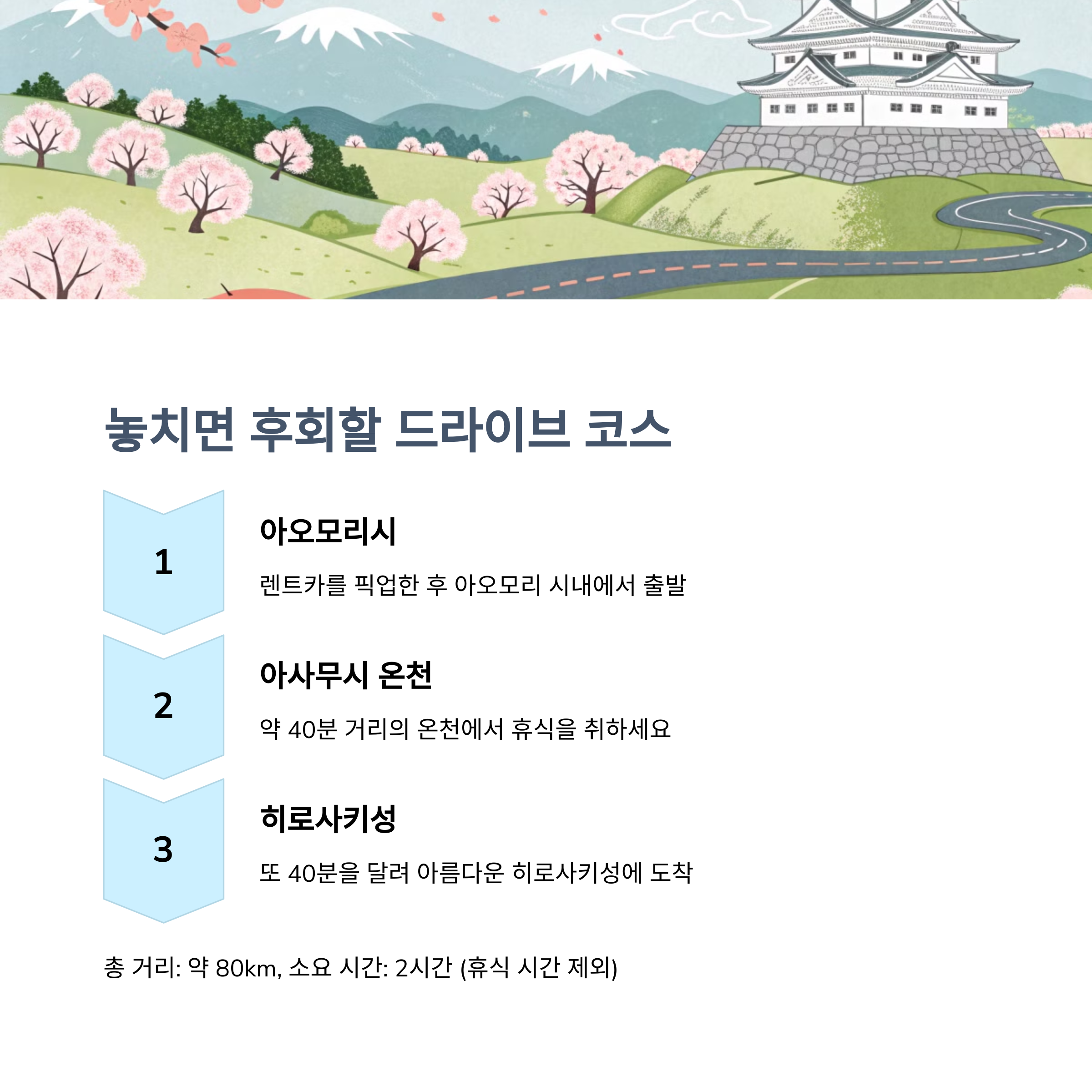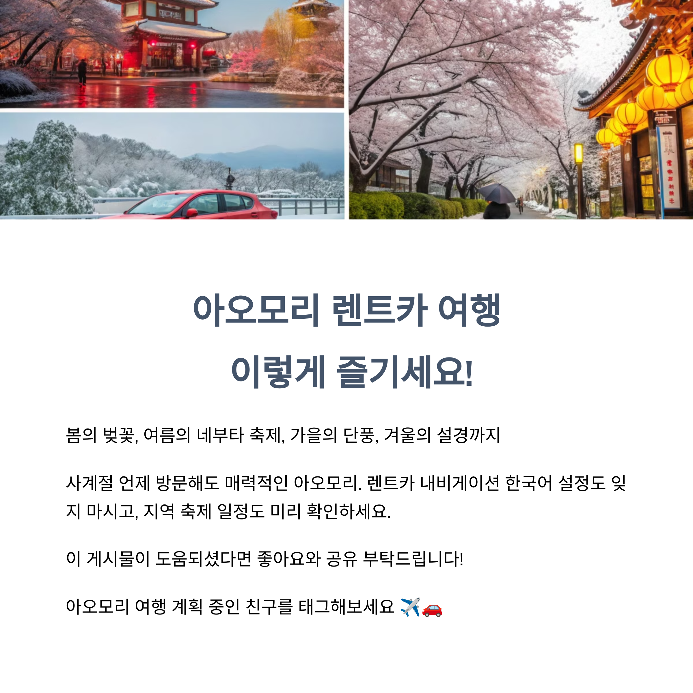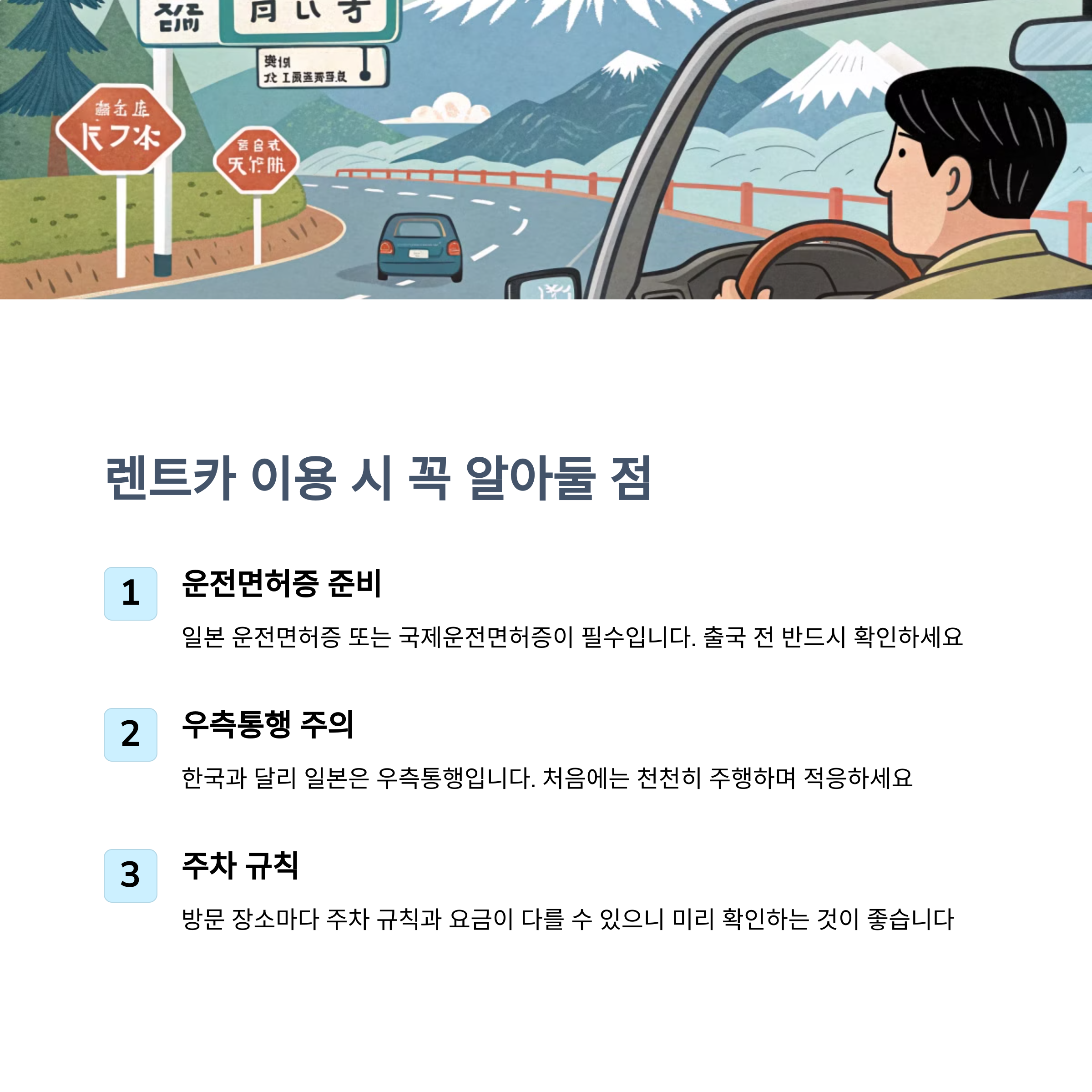 대중교통도 좋지만, 렌트카를 이용하면 더욱 자유롭게 원하는 장소를 방문할 수 있습니다. 아오모리는 자연과 전통이 어우러진 멋진 여행지로, 온천, 미술관, 맛집까지 다양한 코스를 체험할 수 있는 곳입니다.
