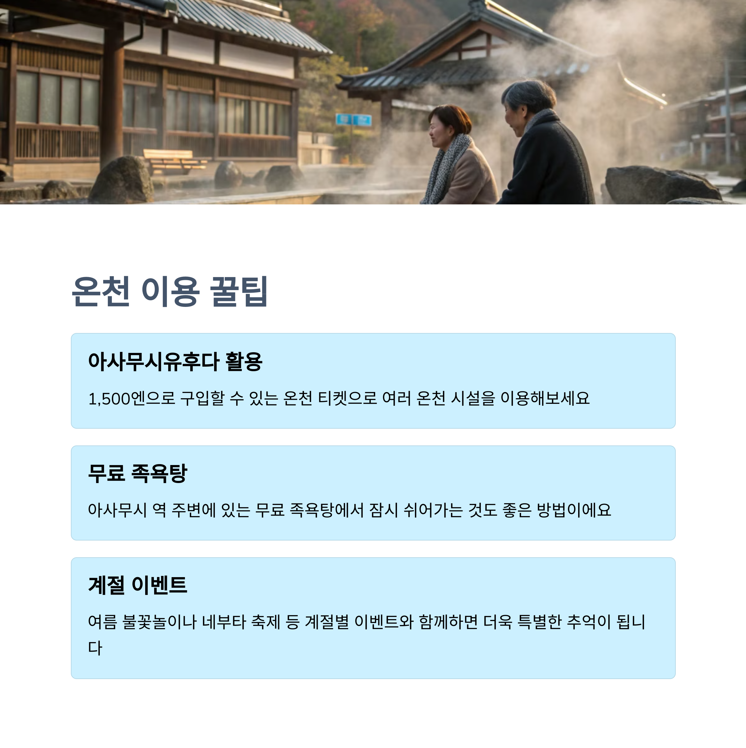 | 4주 전 예약 시 할인 | 전통 일본 온천 체험 가능 | 가리비 구이 유명 |