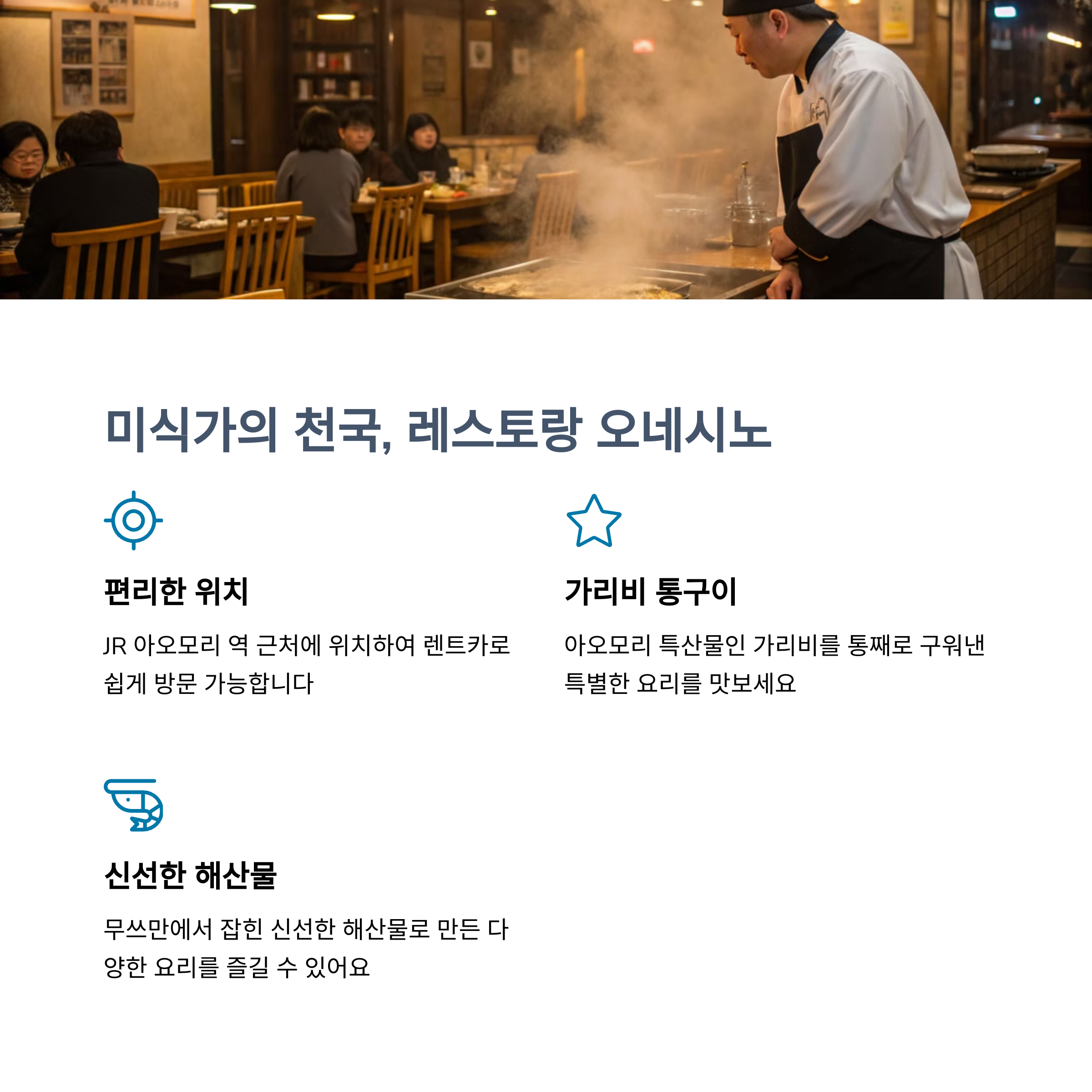 여행의 즐거움을 더해줄 맛집도 놓칠 수 없습니다. 레스토랑 오네시노는 JR 아오모리 역 근처에 위치한 유명 맛집으로, 가리비를 통째로 구워낸 요리가 인기 메뉴입니다.