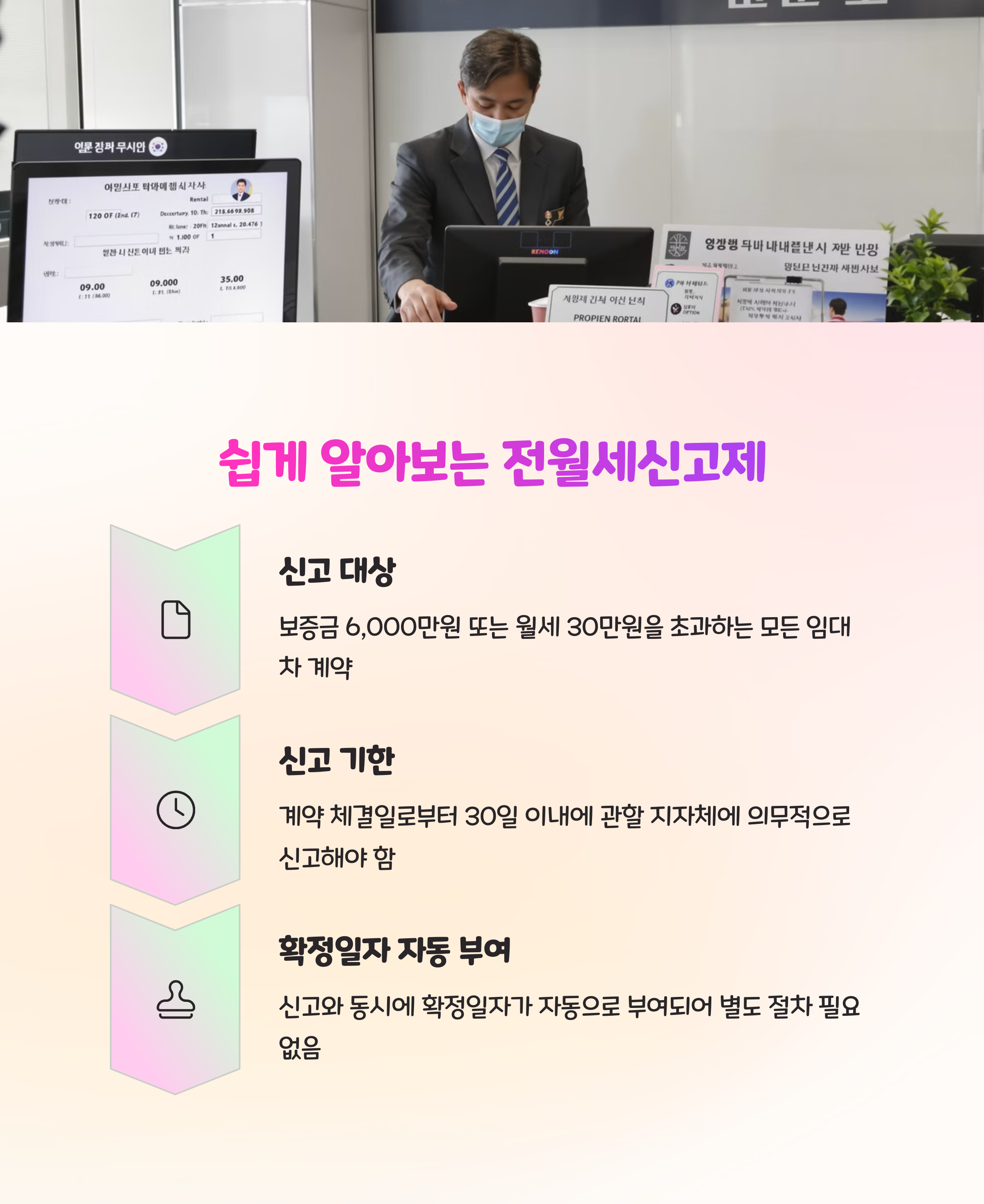 ※ 전월세신고제는 보증금 6,000만원 초과 또는 월세 30만원 초과 시, 30일 이내 신고 의무가 있습니다.