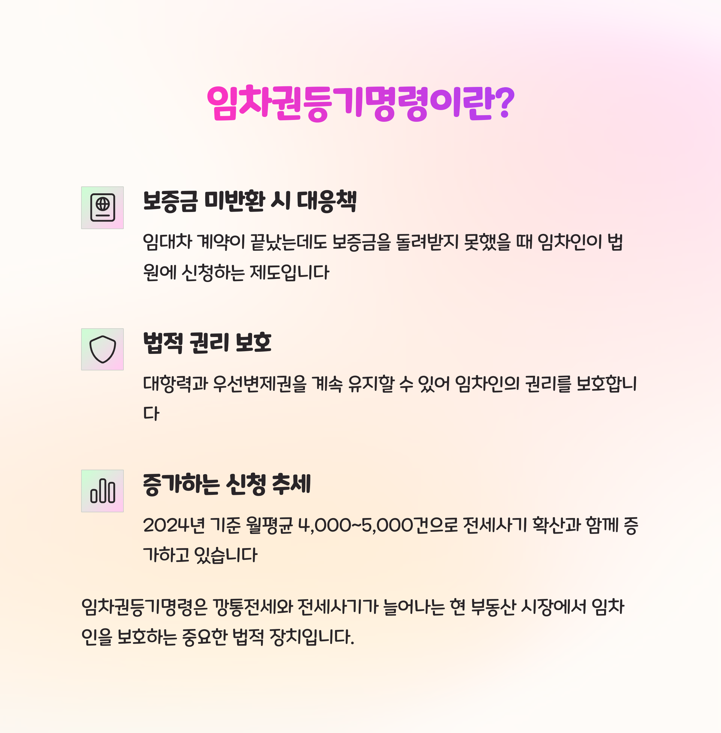 | 임차권등기명령이란? | 임차인이 계약 종료 후 보증금을 못 받을 때 등기로 권리 보장 |