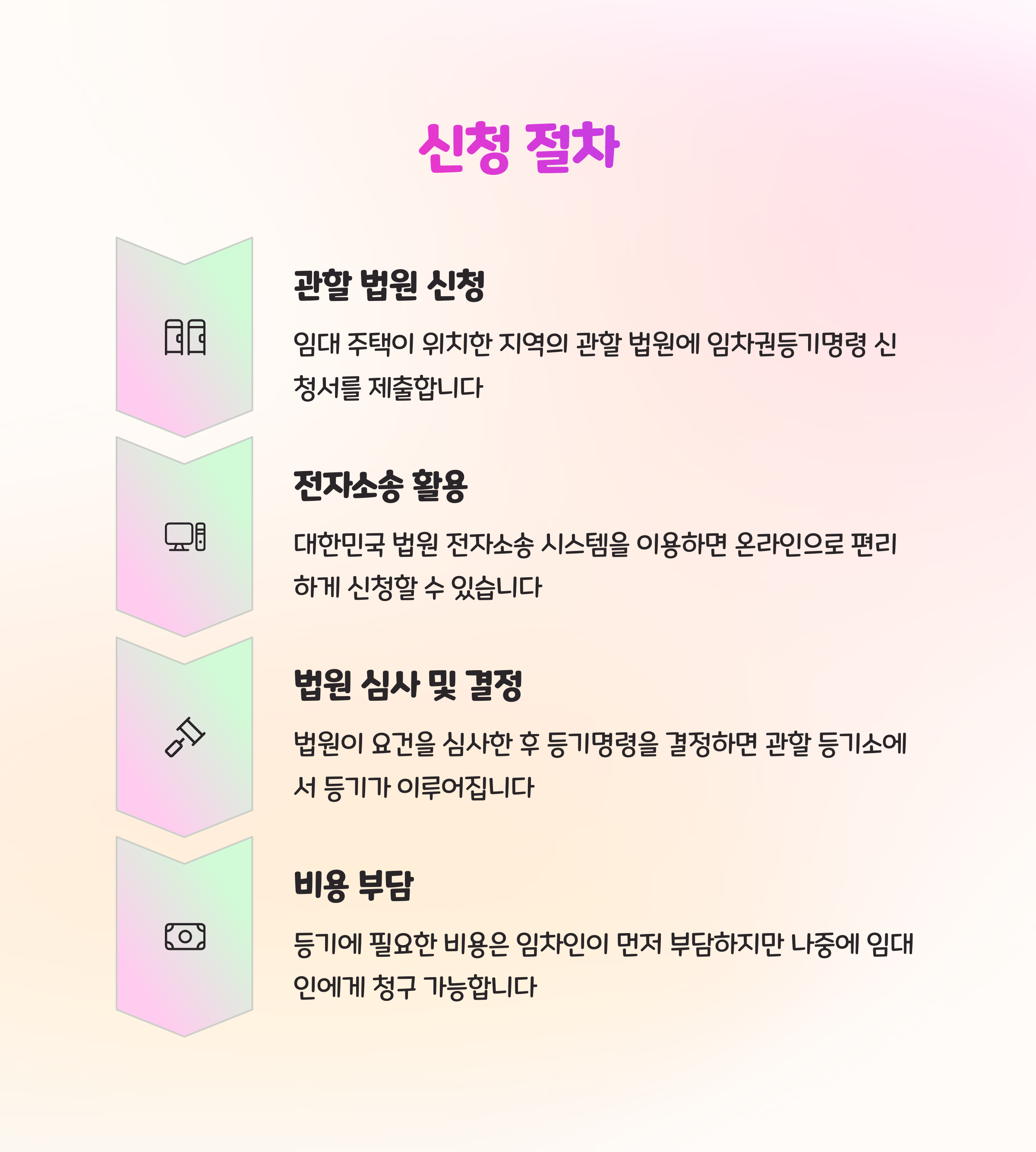 ✅ 법원은 1주일 내외로 결정을 내리고, 이후 등기가 완료되면 전출신고 및 이사도 가능해집니다. 절차는 간단하지만, 실수 없이 진행하는 것이 핵심입니다. 📑