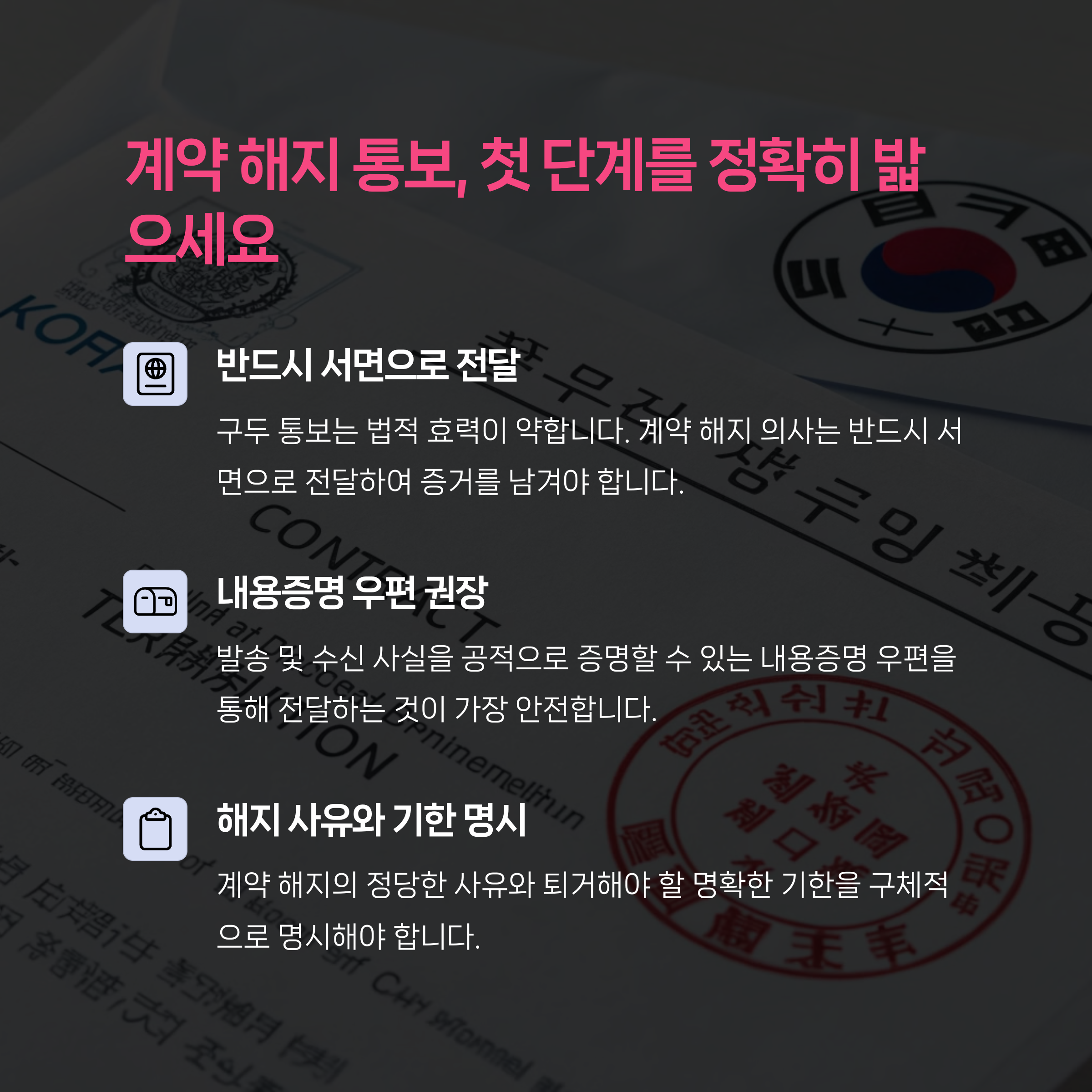 계약 해지는 자동으로 이루어지지 않으며, 반드시 ✔️문서 또는 내용증명 등으로 상대방에게 명확하게 전달되어야 법적 효력이 발생합니다.