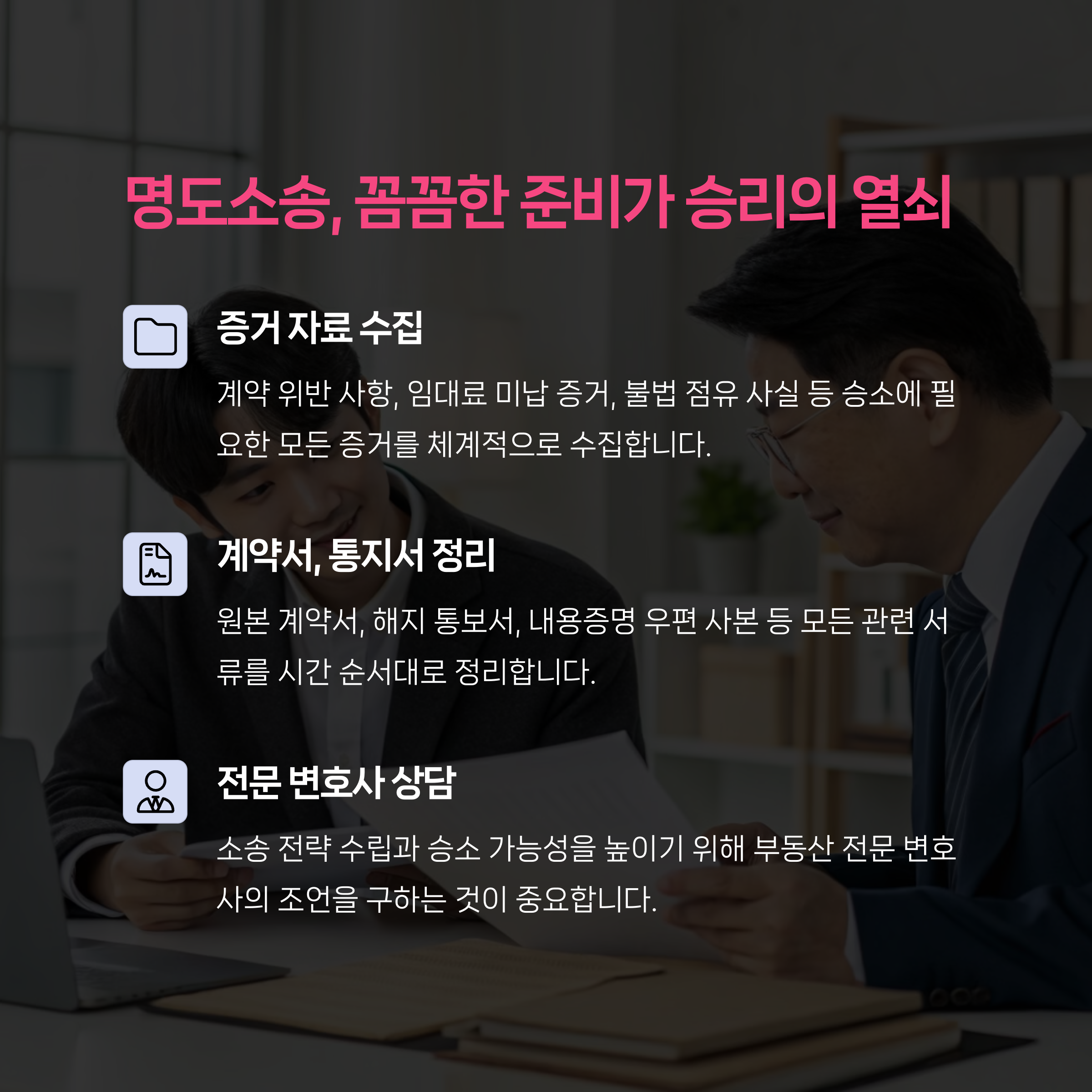 계약 해지 통보부터 소송 진행, 강제집행까지 전 과정을 차근차근 살펴보며 임대인이 꼭 알고 있어야 할 명도소송 가이드를 제공하겠습니다. 명도소송을 앞두고 있다면,