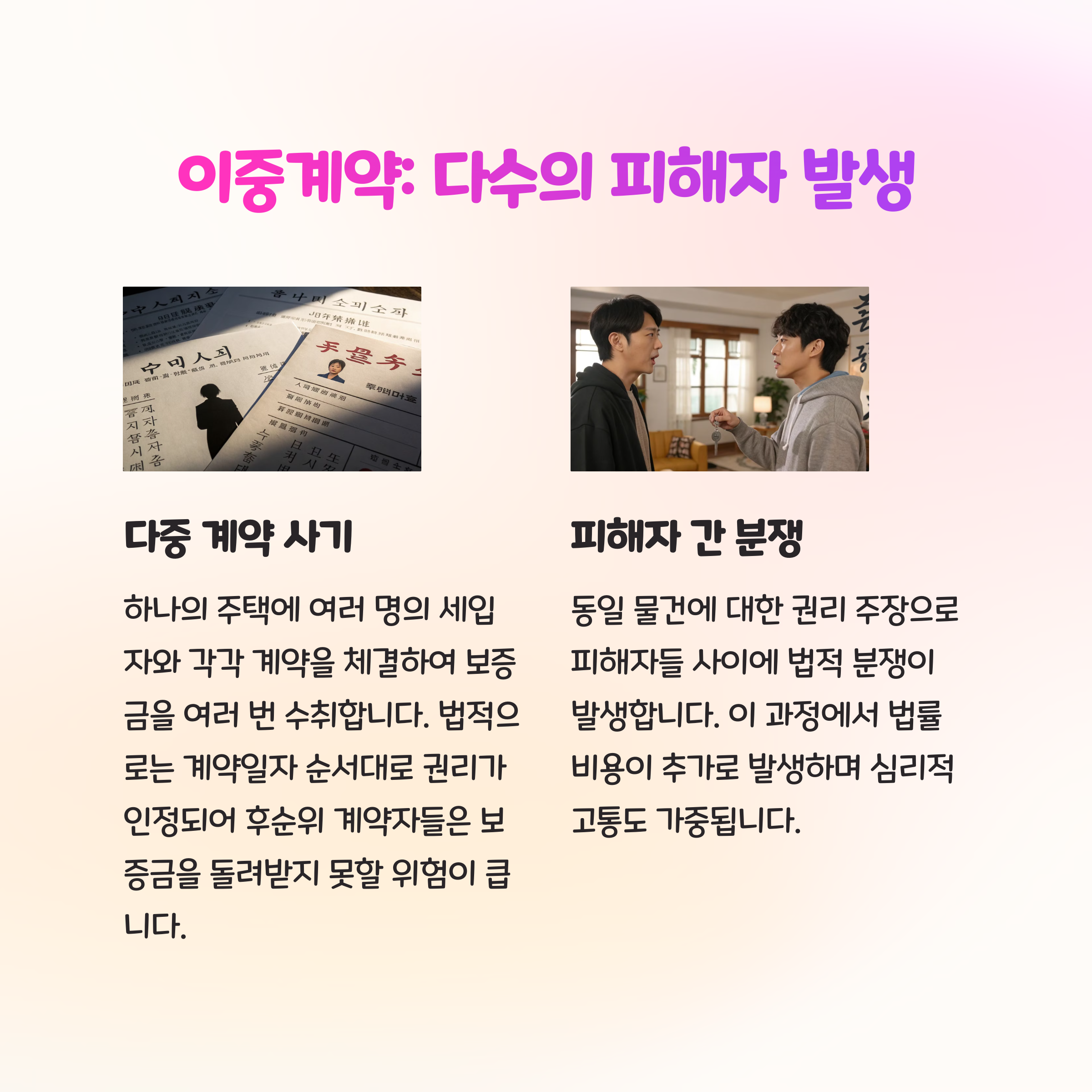 이중계약은 동일한 집을 두 명 이상의 세입자와 계약하는 방식으로, 일부만 보증금을 돌려받게 되는 참사가 발생합니다.