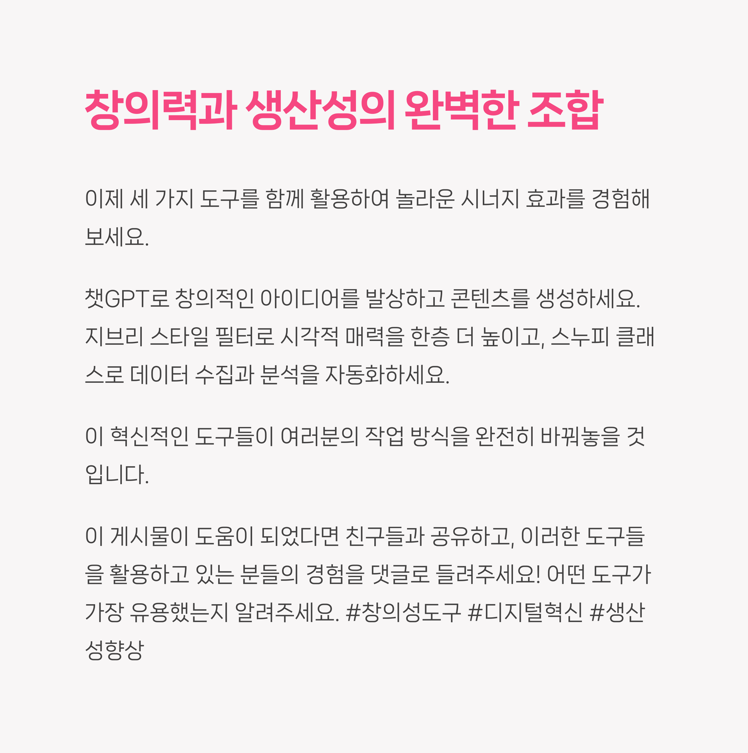 오늘 소개한 모든 도구들은 적절히 조합하면 업무 효율성과 창의성을 동시에 향상시킬 수 있습니다.