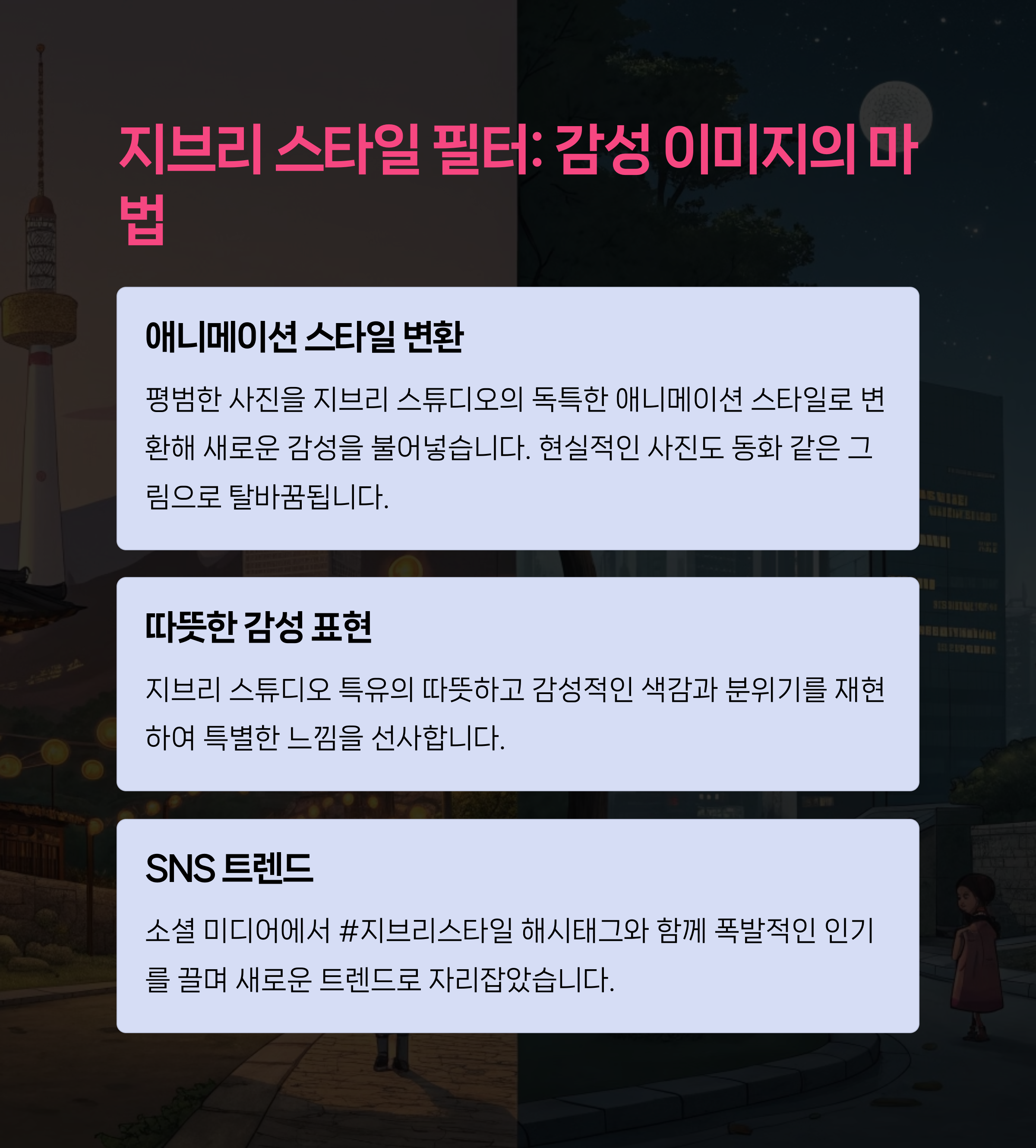 스튜디오 지브리 스타일의 이미지 필터는 사진 한 장으로도 감성적인 작품을 만들어내며, SNS 사용자들 사이에서 큰 인기를 끌고 있습니다.