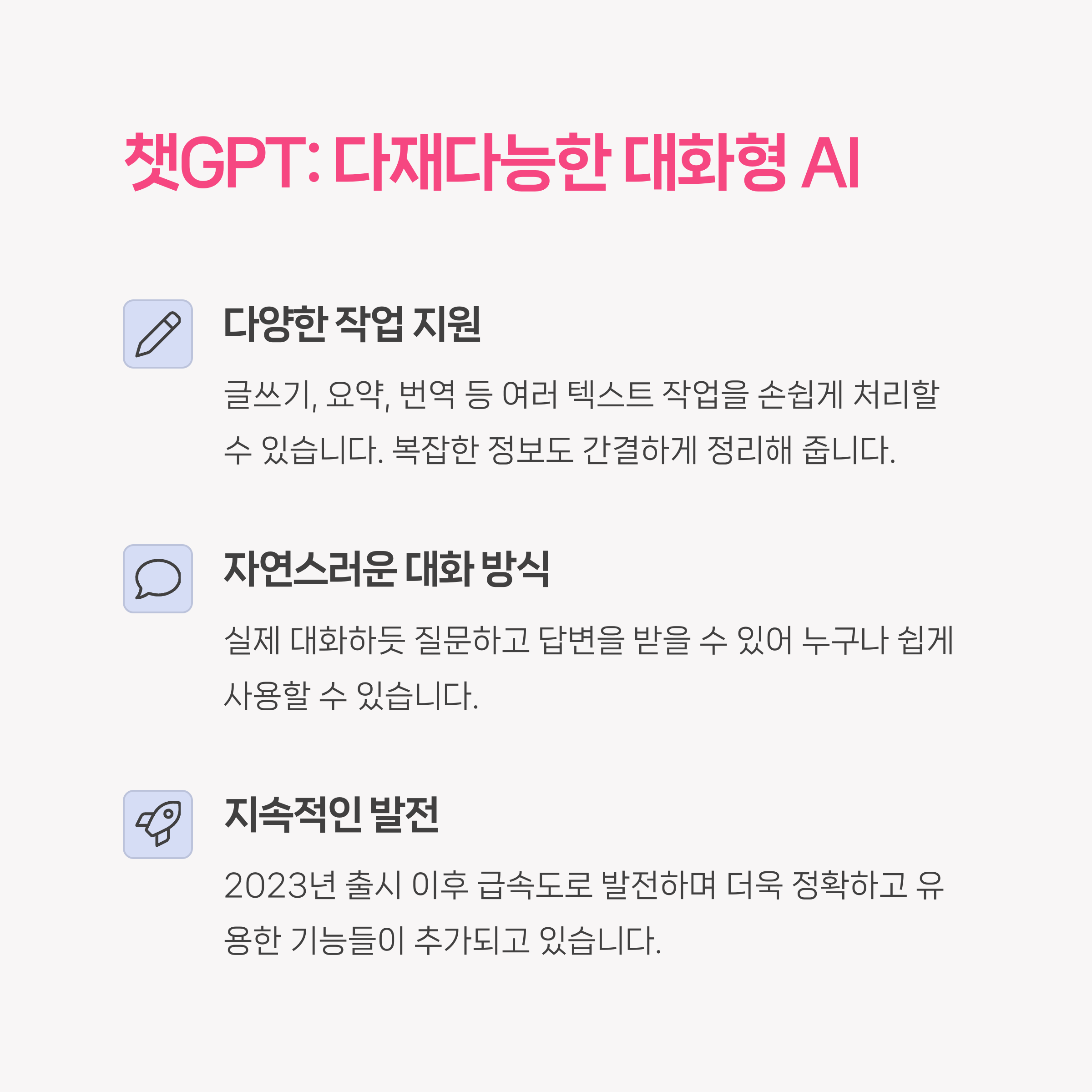 대화창에 입력한 지시나 질문을 분석해 최적의 결과를 도출하며, 글쓰기, 코드 작성, 번역, 요약 등 실무에 매우 유용하게 활용됩니다.