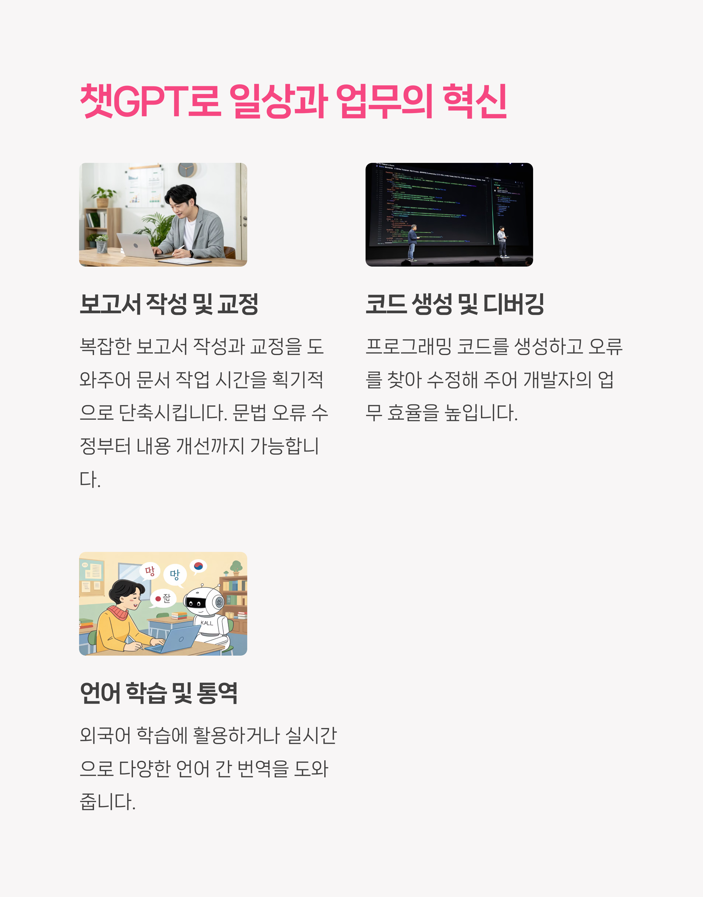 최근 AI 기술의 급속한 발전과 함께, 많은 분들이 챗GPT를 통해 글쓰기, 이미지 생성, 번역, 코딩 등 다양한 업무를 효율적으로 수행하고 있습니다.