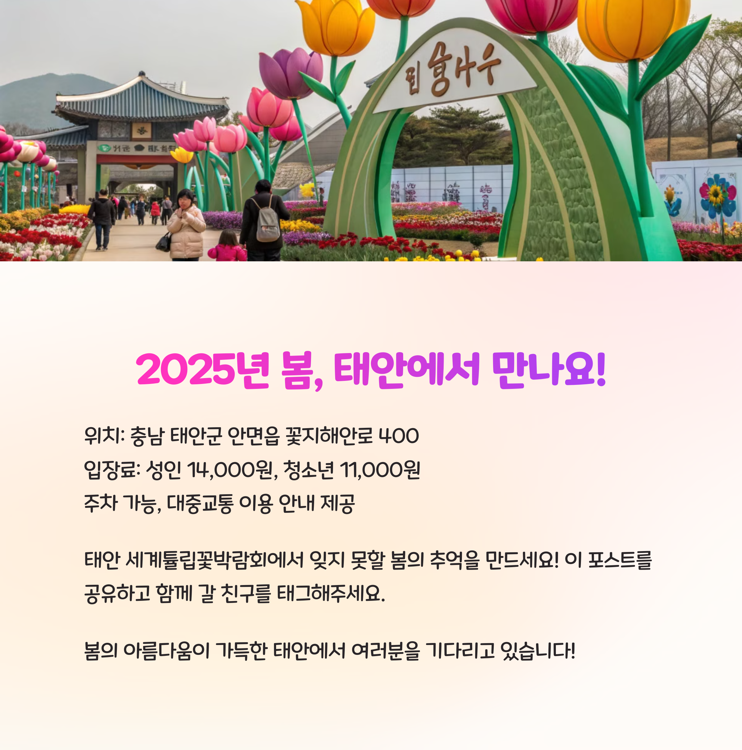 태안 세계튤립꽃박람회에 대한 여러분의 기대, 방문 후 느낀 점, 혹은 추억을 댓글로 남겨주세요.💬🗨️