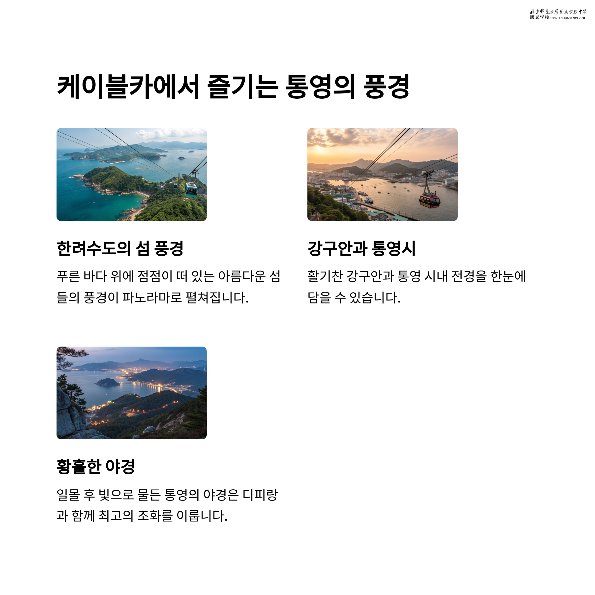 미륵산 케이블카국내 최장 길이를 자랑하는 케이블카로, 약 9분간의 탑승 동안 통영의 아름다운 바다와 섬들을 감상할 수 있습니다.