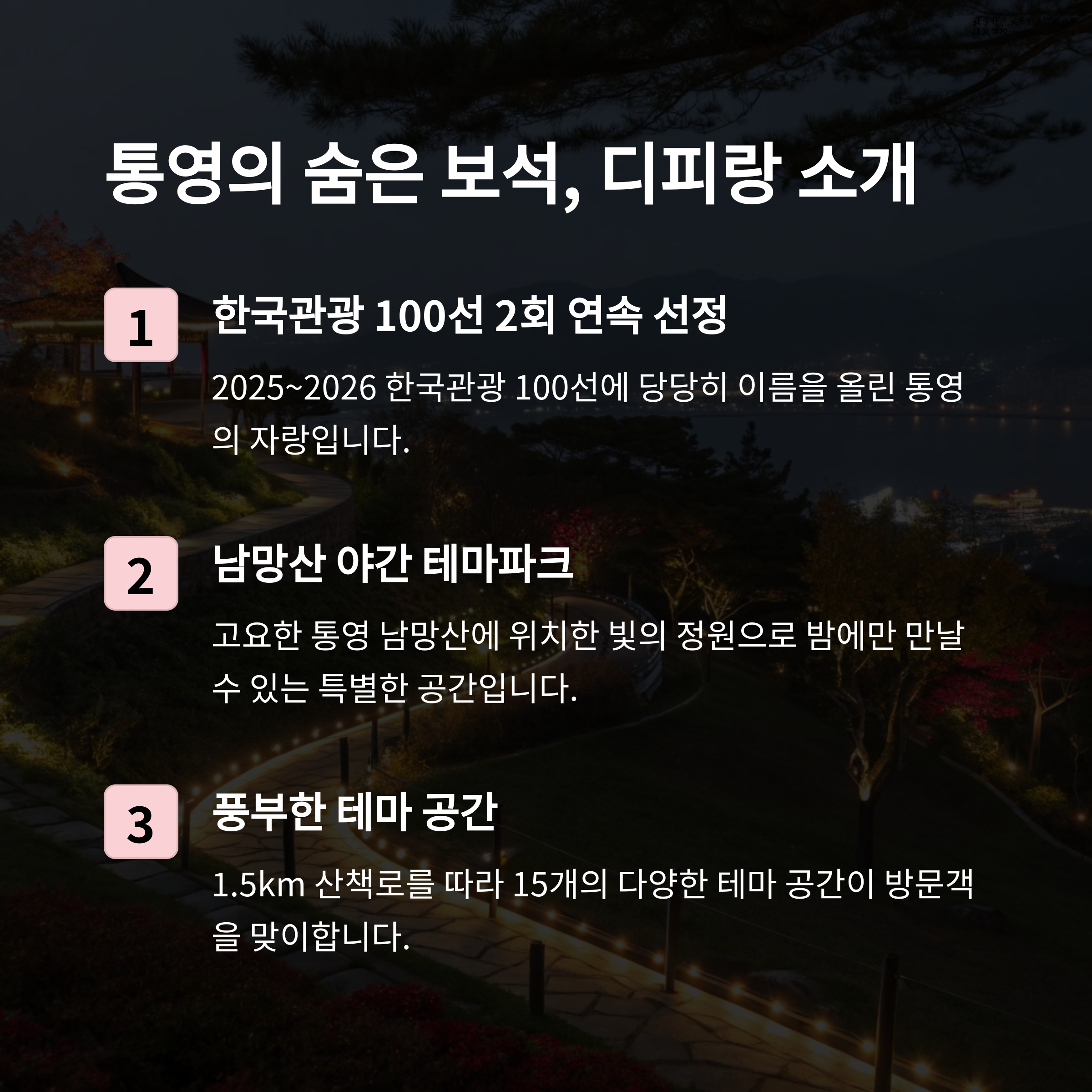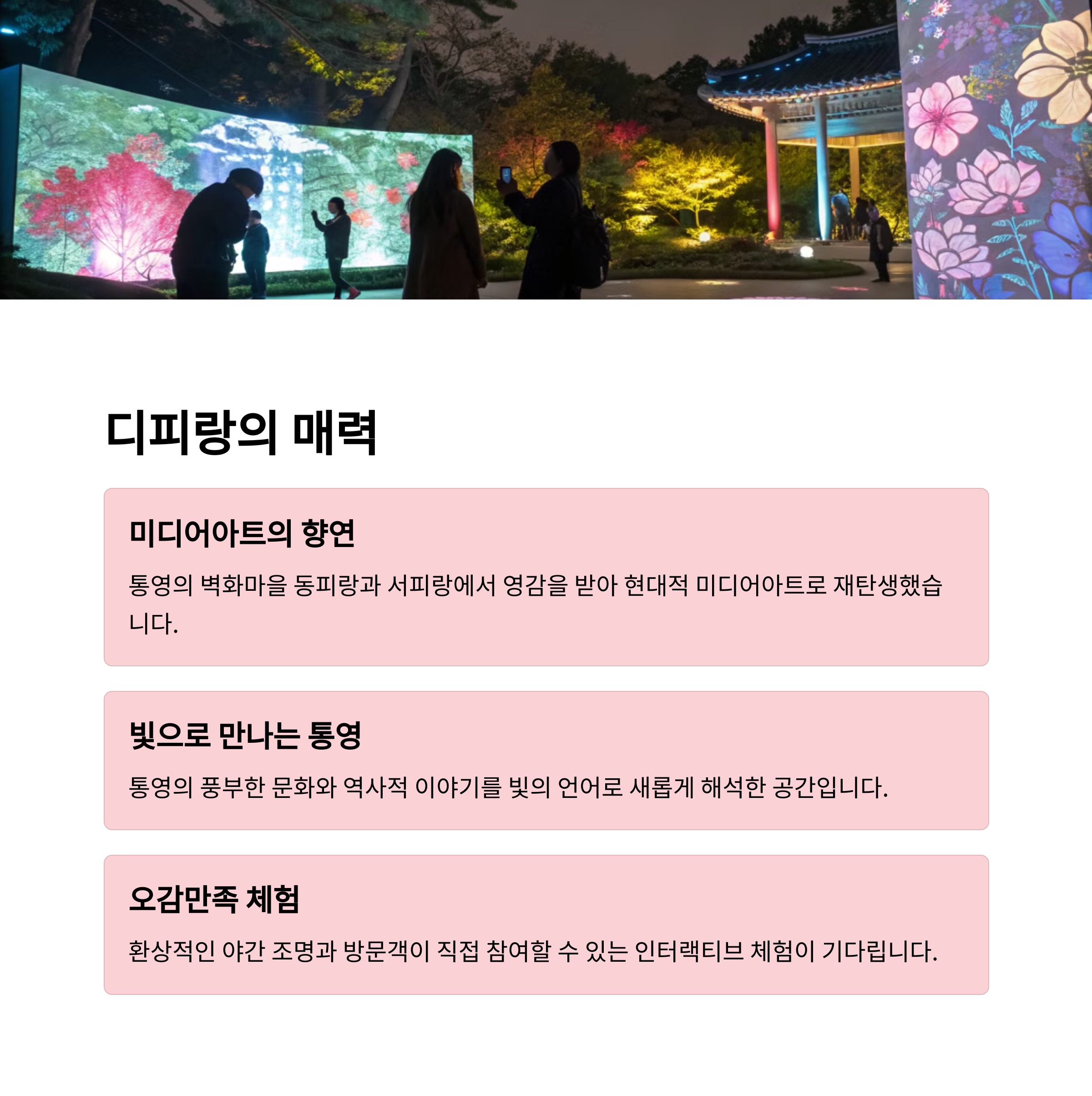 디피랑은 통영을 대표하는 야경 명소로, 미디어아트를 활용한 환상적인 빛의 정원을 경험할 수 있는 곳입니다.