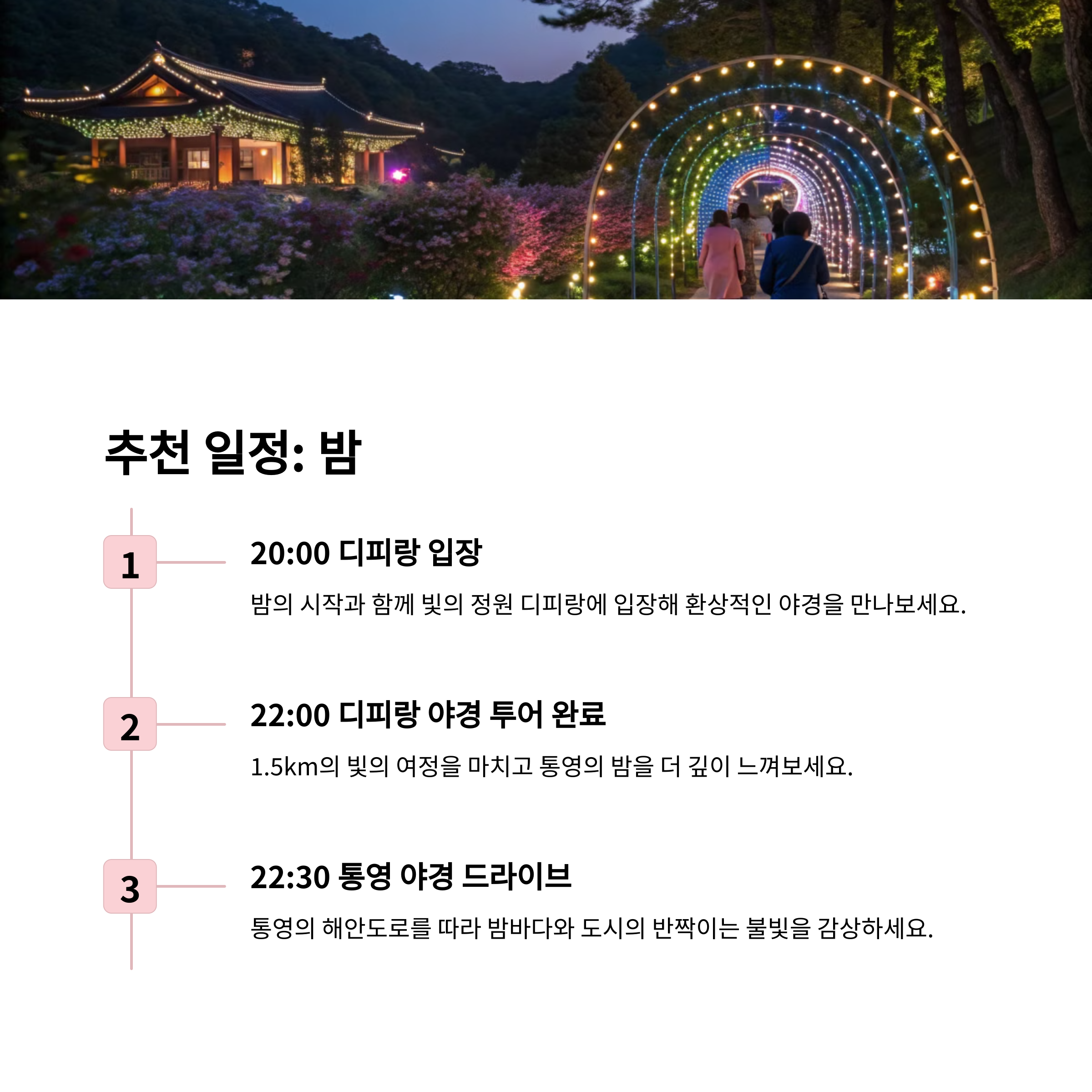 통영에서 하루를 보낸다면 미륵산 케이블카와 디피랑 야경은 필수 코스입니다. 낮에는 아름다운 자연경관을, 밤에는 화려한 빛의 정원을 감상하며 통영의 매력을 가득 느낄 수 있습니다.
