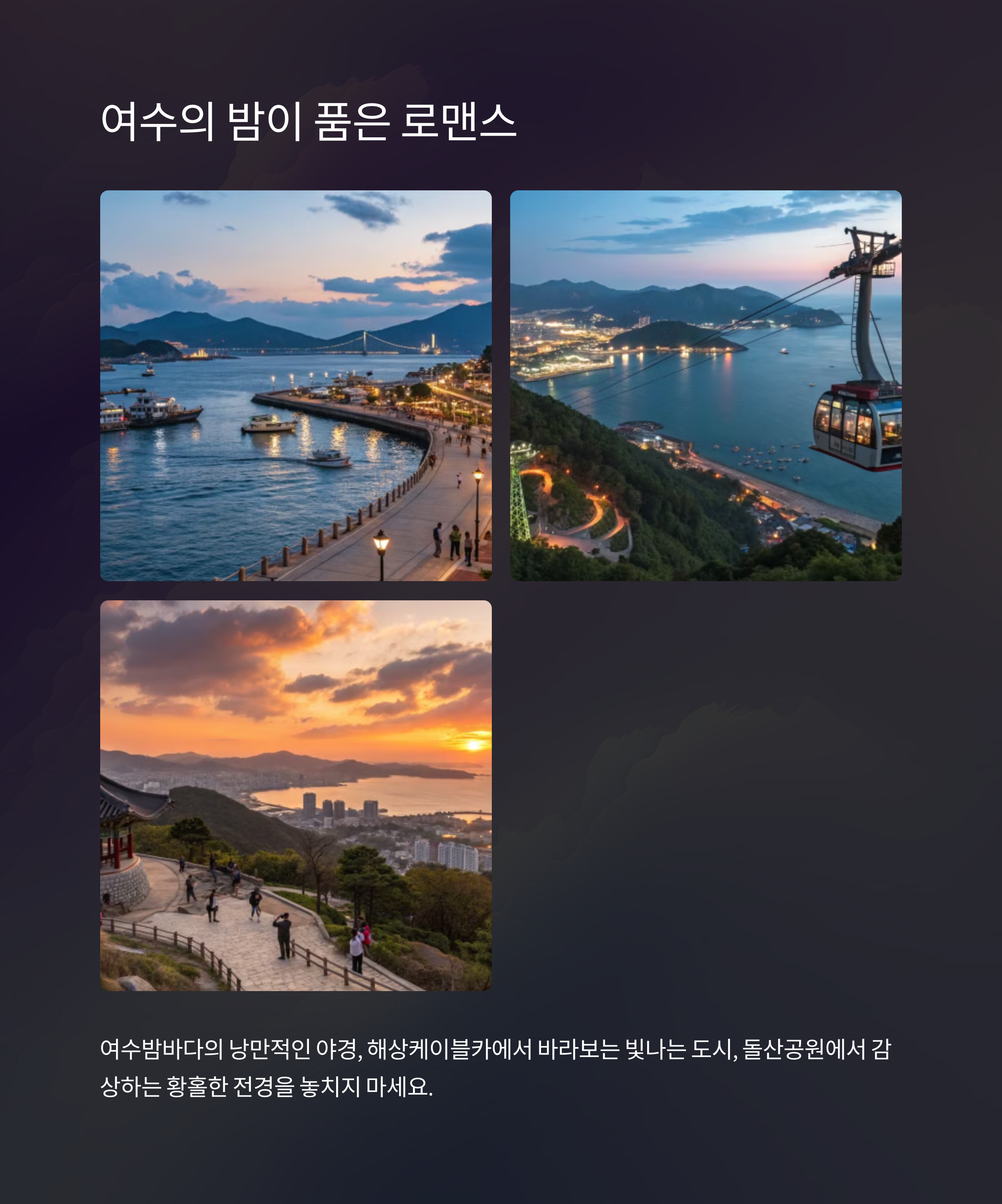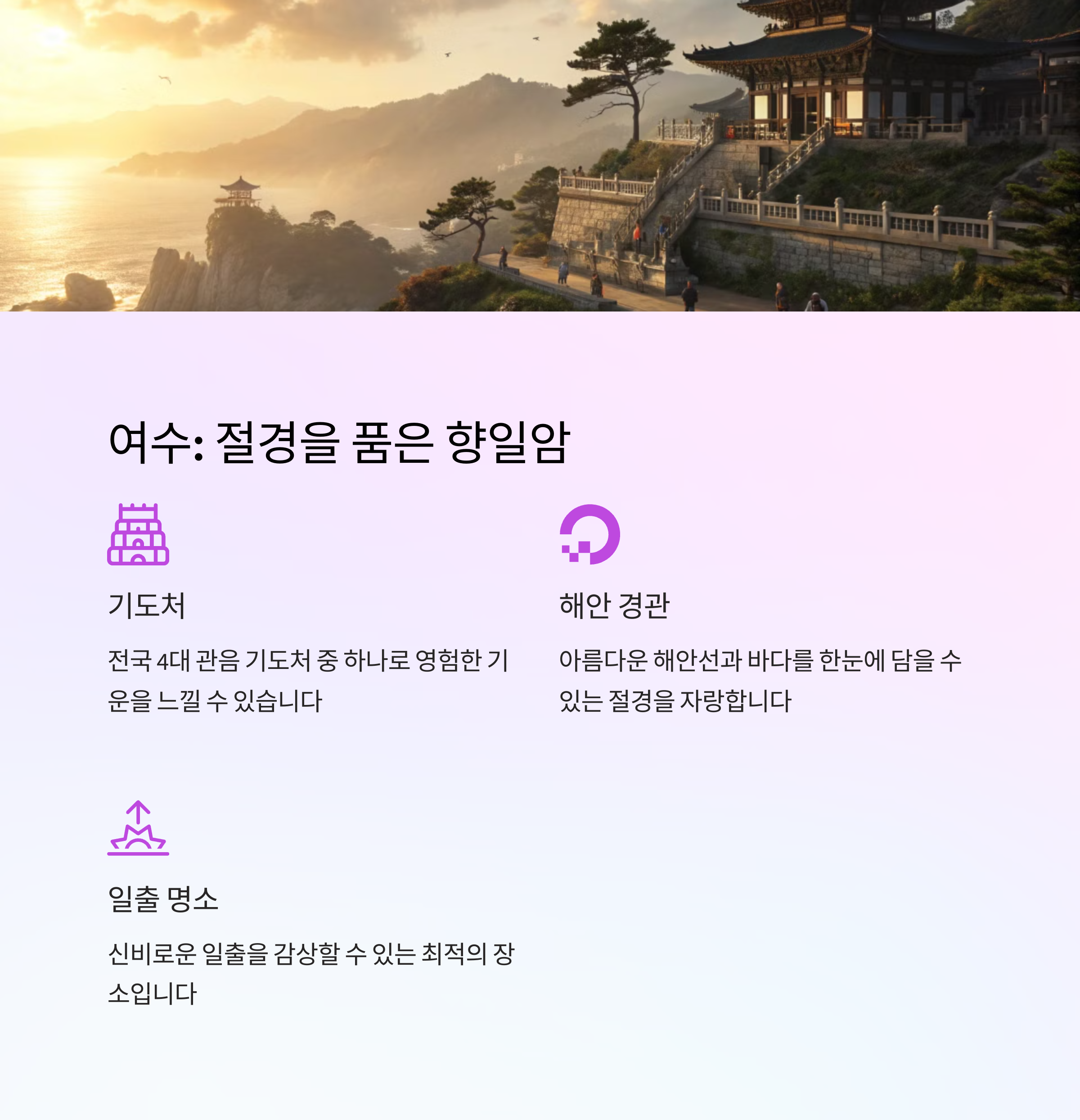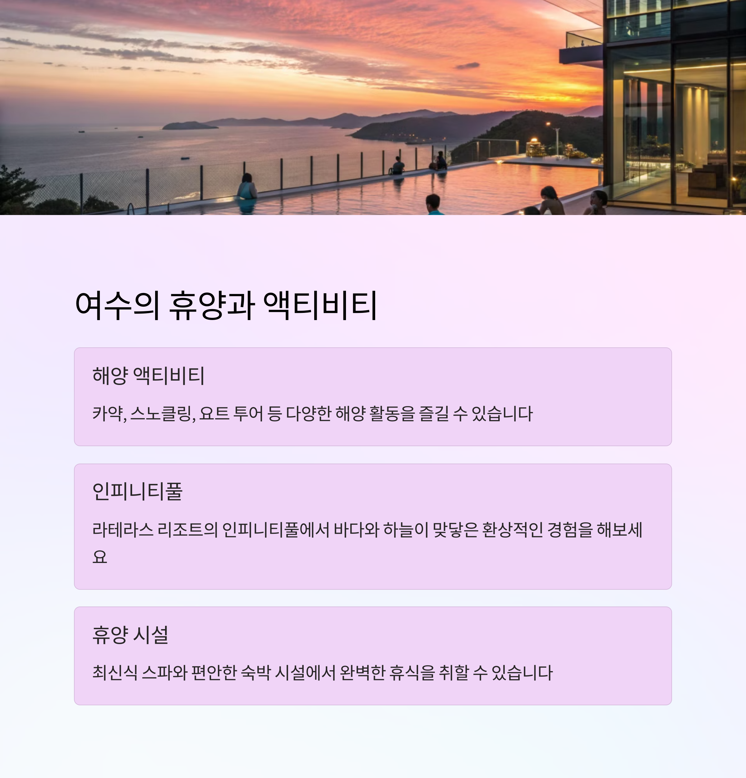 | 새해 해돋이 명소로 유명 | 여수의 대표적인 럭셔리 숙소 | UNESCO 세계자연유산 지정 |