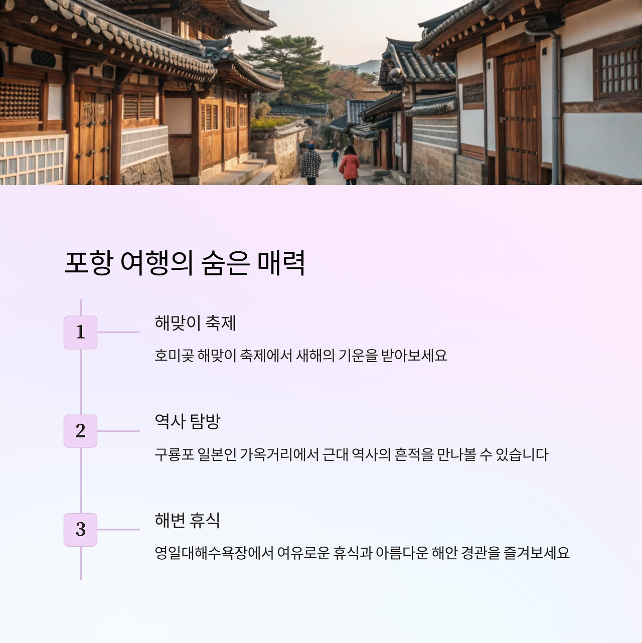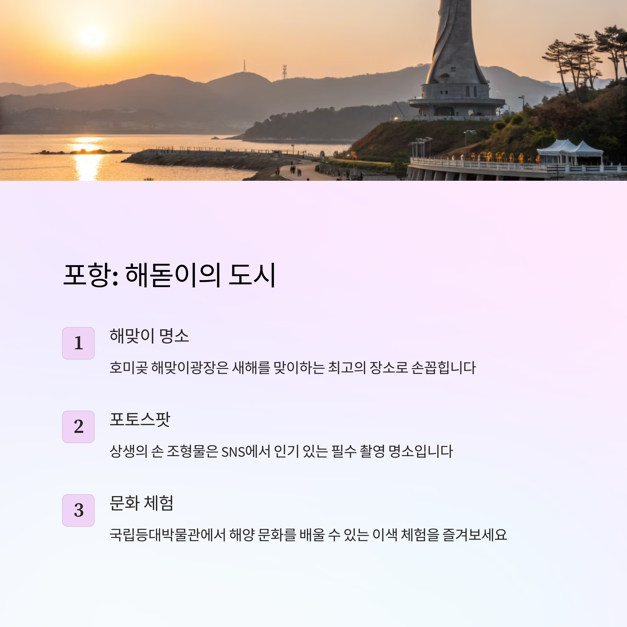 국내 여행을 떠날 계획이라면, 포항, 여수, 제주는 각기 다른 매력을 가진 인기 여행지로 손꼽힙니다.