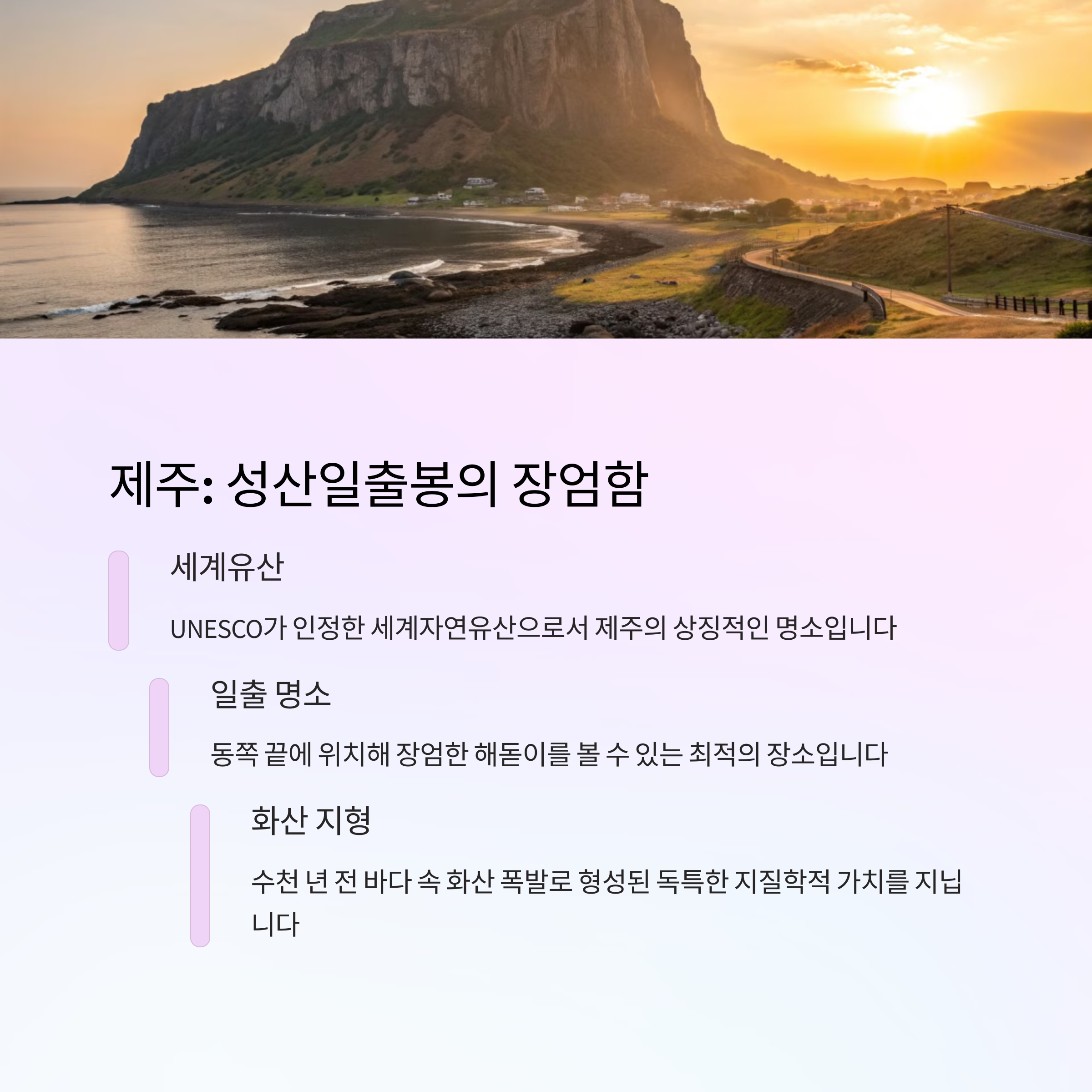 특히, UNESCO 세계자연유산으로 지정된 성산일출봉은 최고의 해돋이 명소로 손꼽히며, 이른 아침 일출을 감상하기에 최적의 장소입니다.