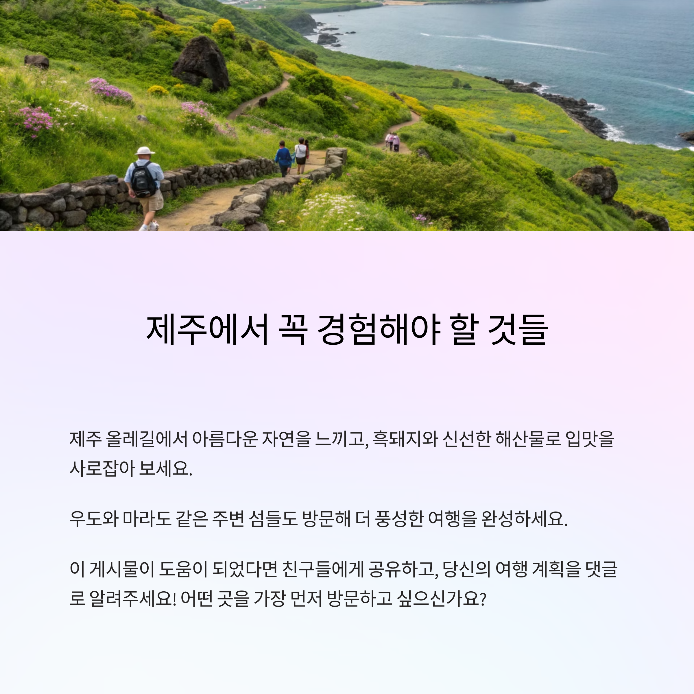 포항, 여수, 제주 중 여러분의 선택은 어디인가요? 여행 경험이 있다면 댓글로 공유해 주세요! 추천 여행 코스나 꿀팁이 있다면 함께 나눠보아요.
