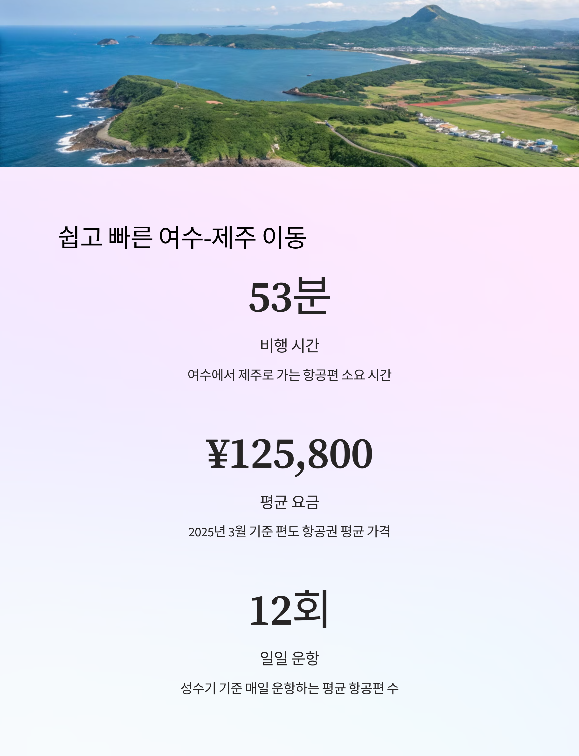 특히, 여수는 다양한 숙박 시설과 해양 활동이 풍부한 곳입니다. 인피니티풀이 있는 라테라스 리조트에서 여유로운 휴식을 취할 수도 있고, 아름다운 밤바다를 감상하며 낭만적인 여행을 즐길 수도 있습니다. 또한, 여수에서 제주로의 항공편은 약 53분이 소요되며, 평균 요금 125,800원으로 비교적 접근성이 좋습니다.