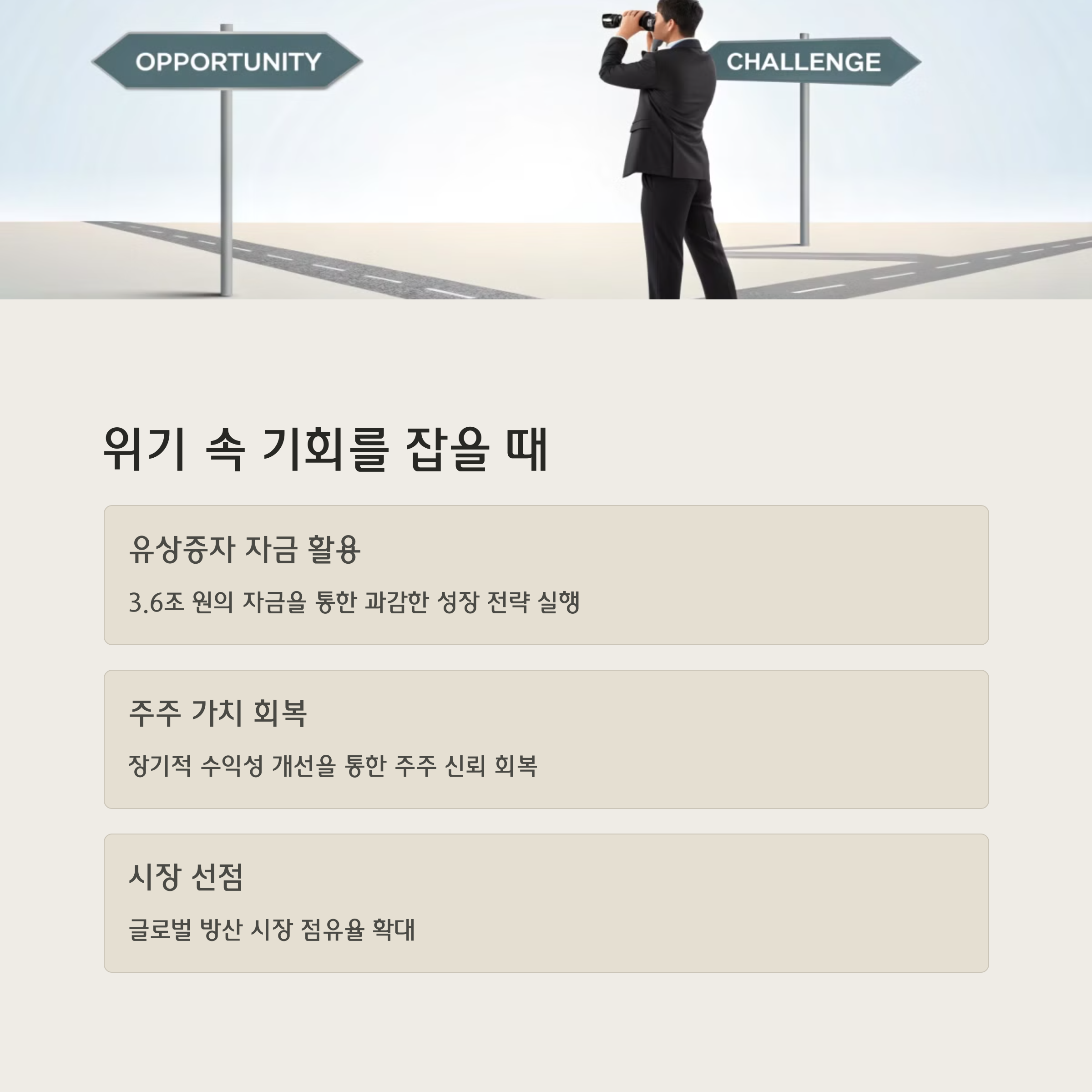 유증은 주주들에게 자금 조달을 위한 부담으로 작용하지만, 이는 회사의 글로벌 방위 시장 확장을 위한 중요한 전략으로 볼 수 있습니다.