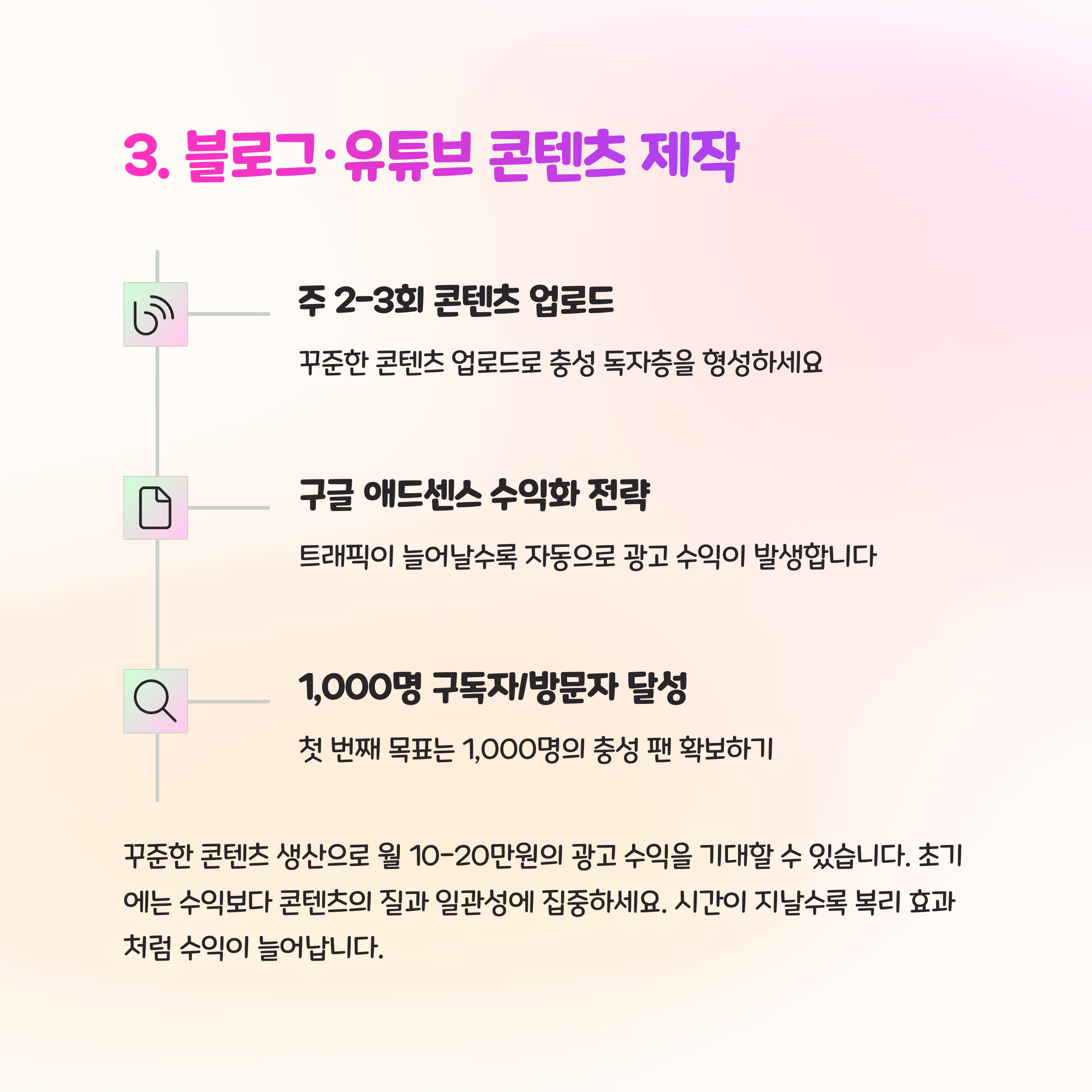 초기에는 수익이 없더라도, 하나의 글이나 영상이 지속적으로 방문자와 광고 수익을 만들어냅니다.