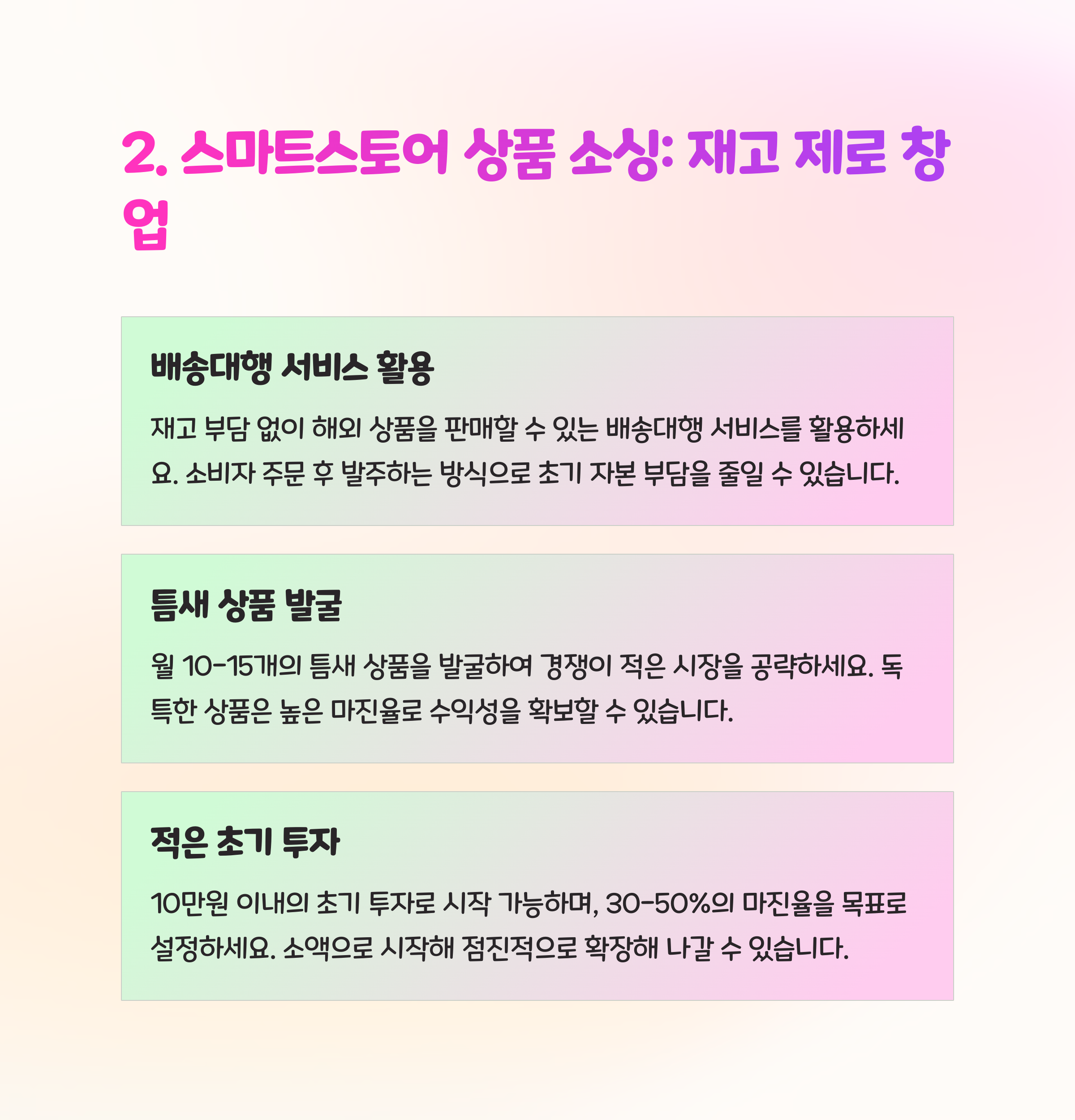중복 제품보다 틈새시장을 공략하는 것이 포인트입니다. 출산·육아, 1인가구, 재택근무용 아이템 등 특정 타깃을 명확히 정하세요.