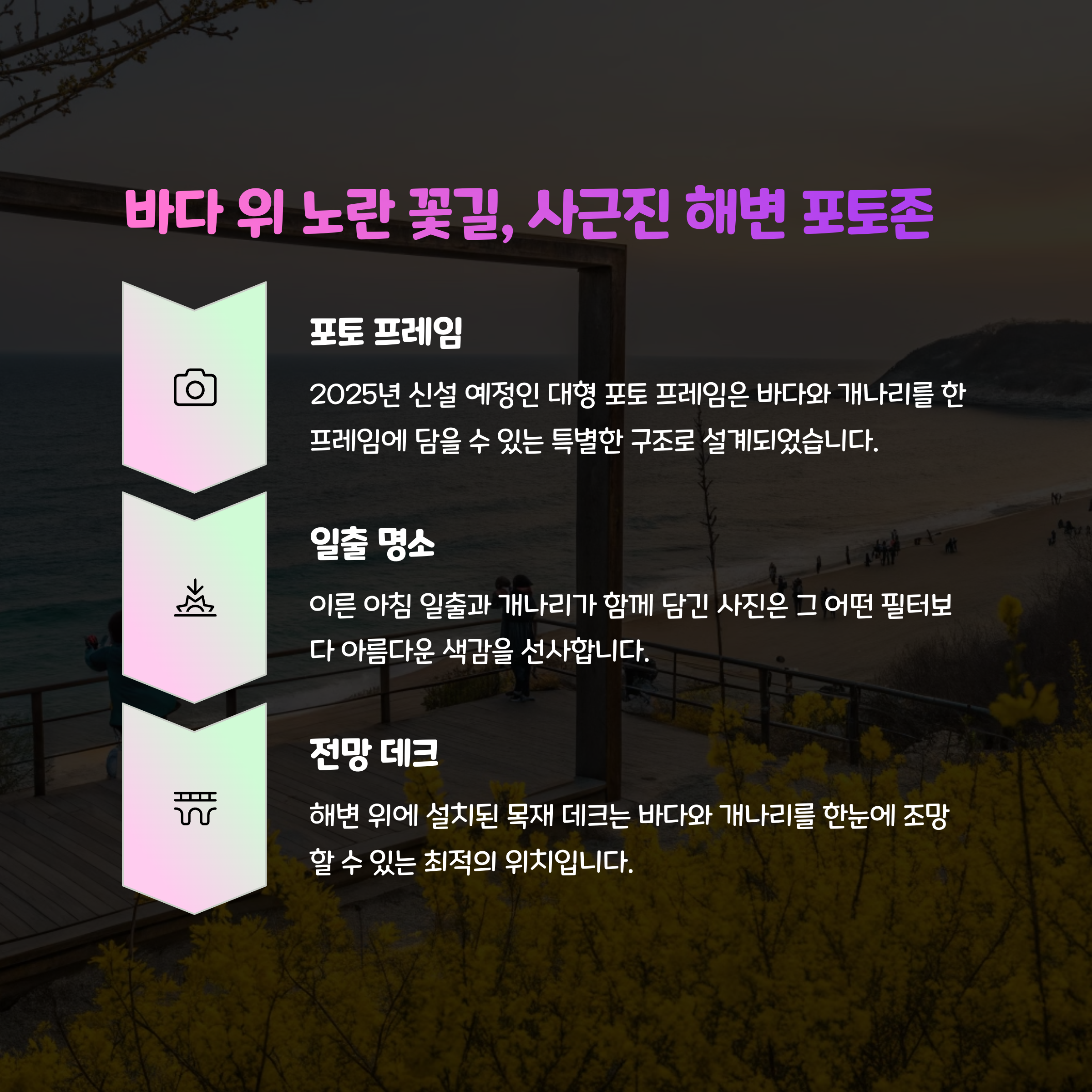 로컬 포토존은 SNS 감성 사진을 원하는 분들에게 최적의 장소입니다. 사근진 해변 포토존은 드라마나 광고에서 자주 등장하는 곳으로, 특별한 연출 없이도 감성적인 사진을 남길 수 있습니다.📸