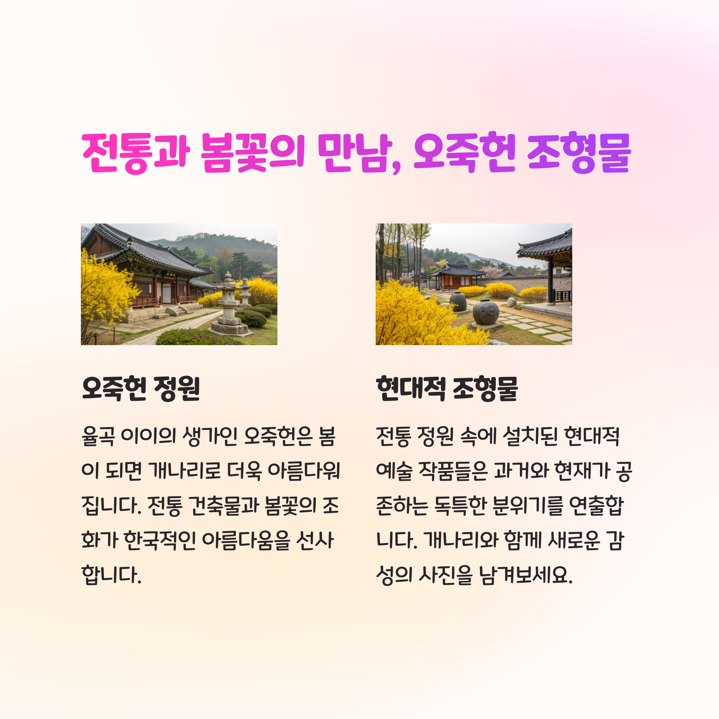 강문해변 솔숲길은 바다와 소나무 사이로 조용한 개나리 뷰를 감상할 수 있어 한적한 분위기를 찾는 이들에게 인기이며, 오죽헌 주변의 조형물은 전통미와 현대미가 공존하는 매력을 갖추고 있어 독특한 배경 사진을 연출하기 좋습니다.👍