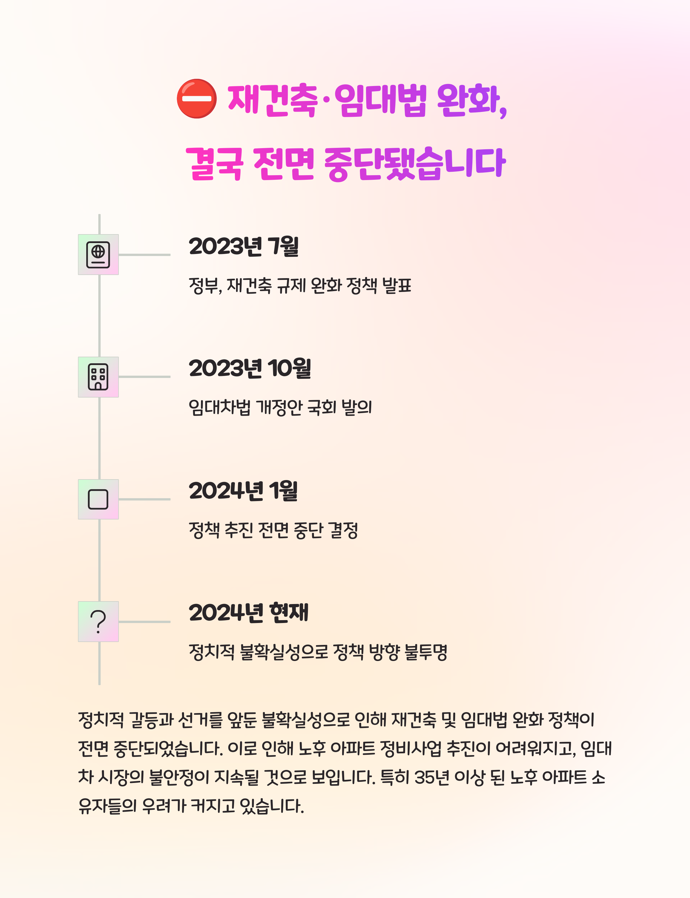 최근 윤 대통령의 탄핵 정국과 더불어, 여당의 정책 추진력이 약화되며 재건축 초과이익 환수제 폐지, 임대차2법 개정 등 핵심 법안이 전면 중단되었습니다.